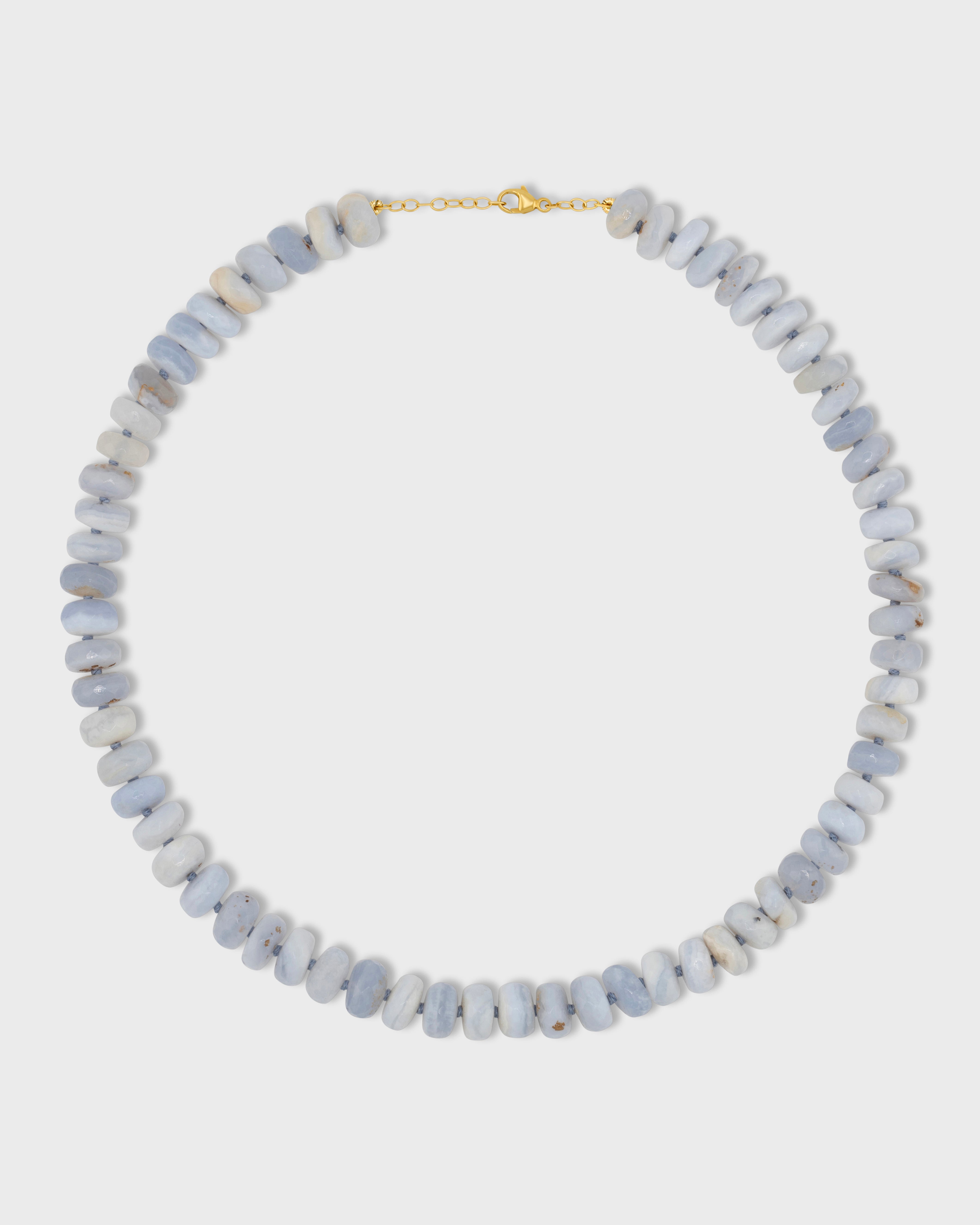 Soft blue lace agate crystal hand strung in New York City and finished with 14 karat yellow gold.