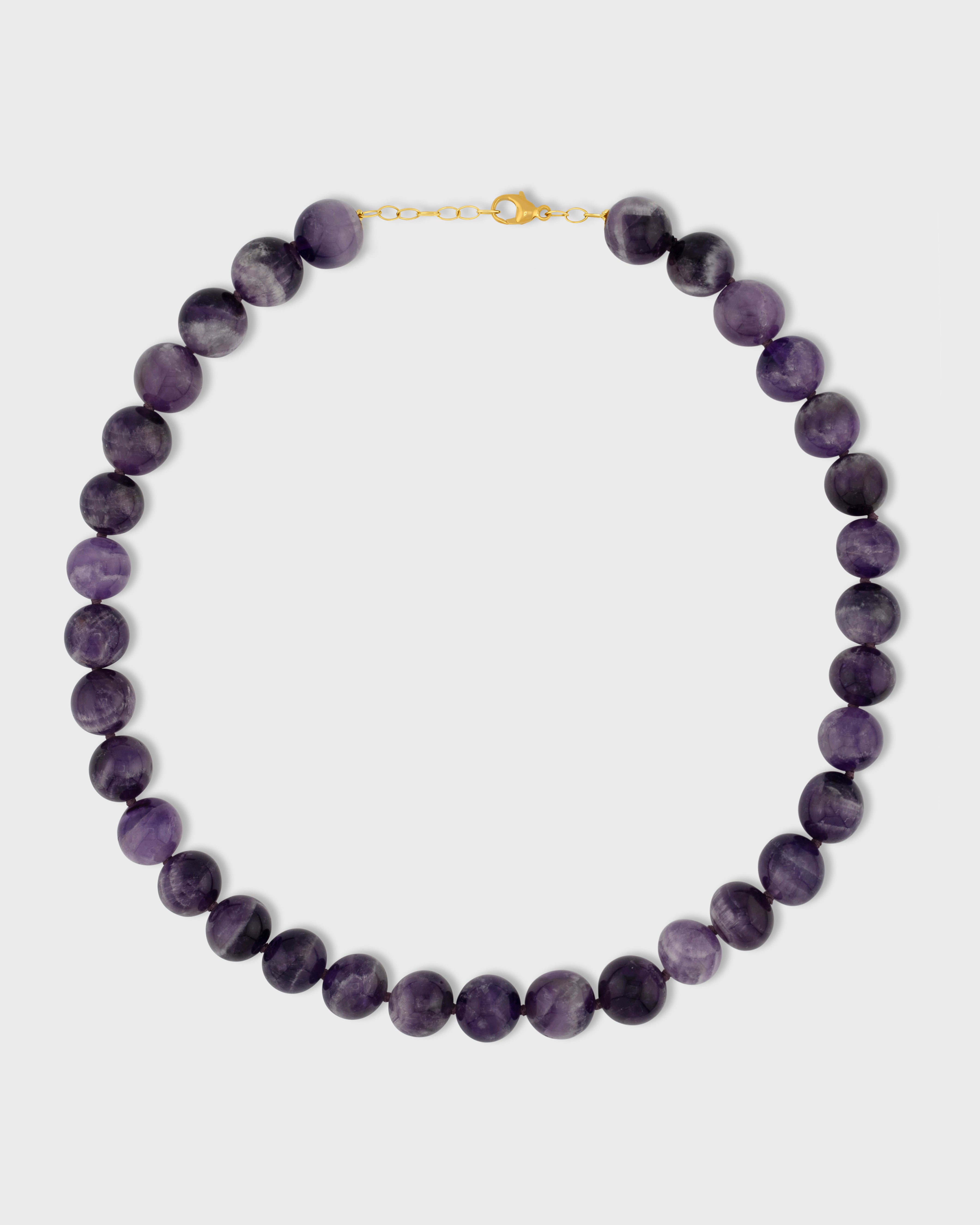 This bold and energetic necklace is made with chevron amethyst beads, known for their unique V-shaped patterns and deep purple shades. It enhances spiritual awareness and provides clarity while fostering peace and intuition.