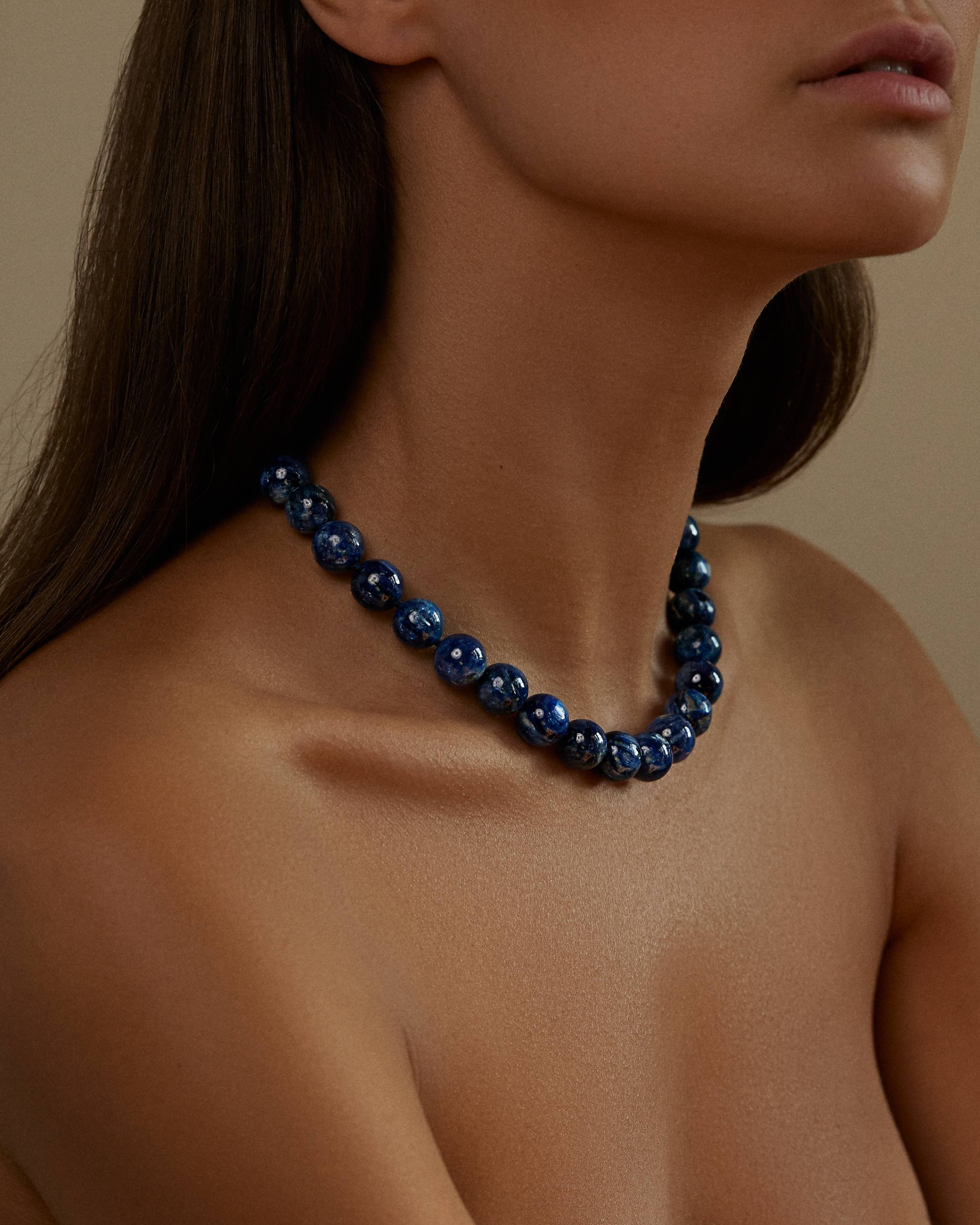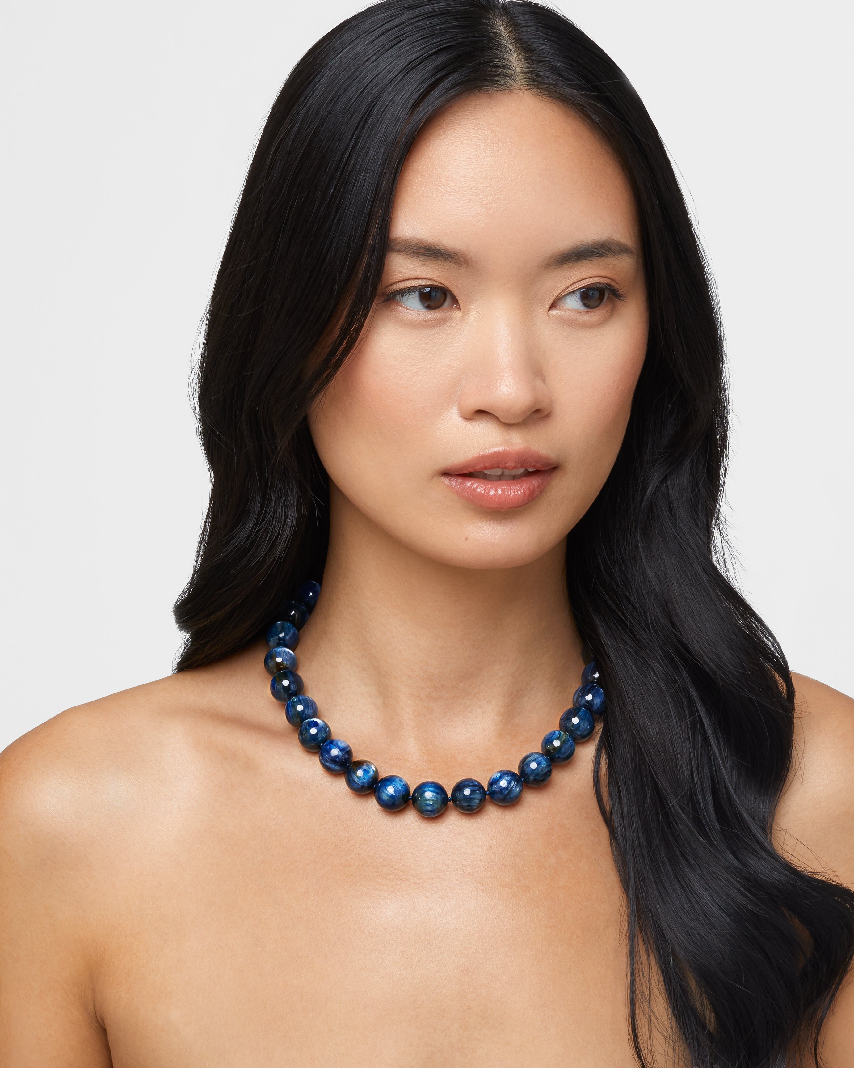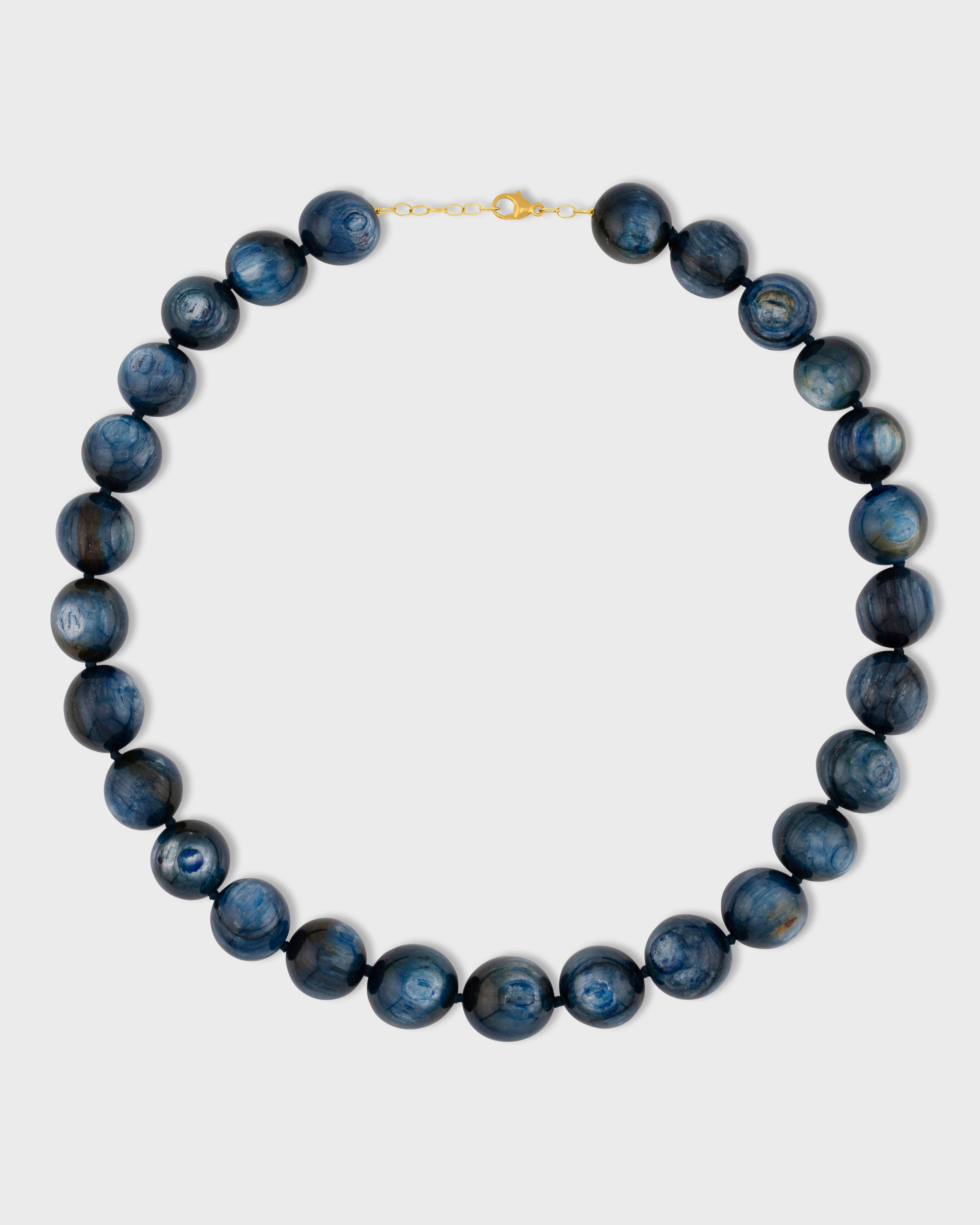 The Kyanite crystal spheres on this necklace capture a tranquil blue energy, promoting mental clarity and calmness. It is an elegant piece that brings balance and a sense of peace to both the wearer and their surroundings.