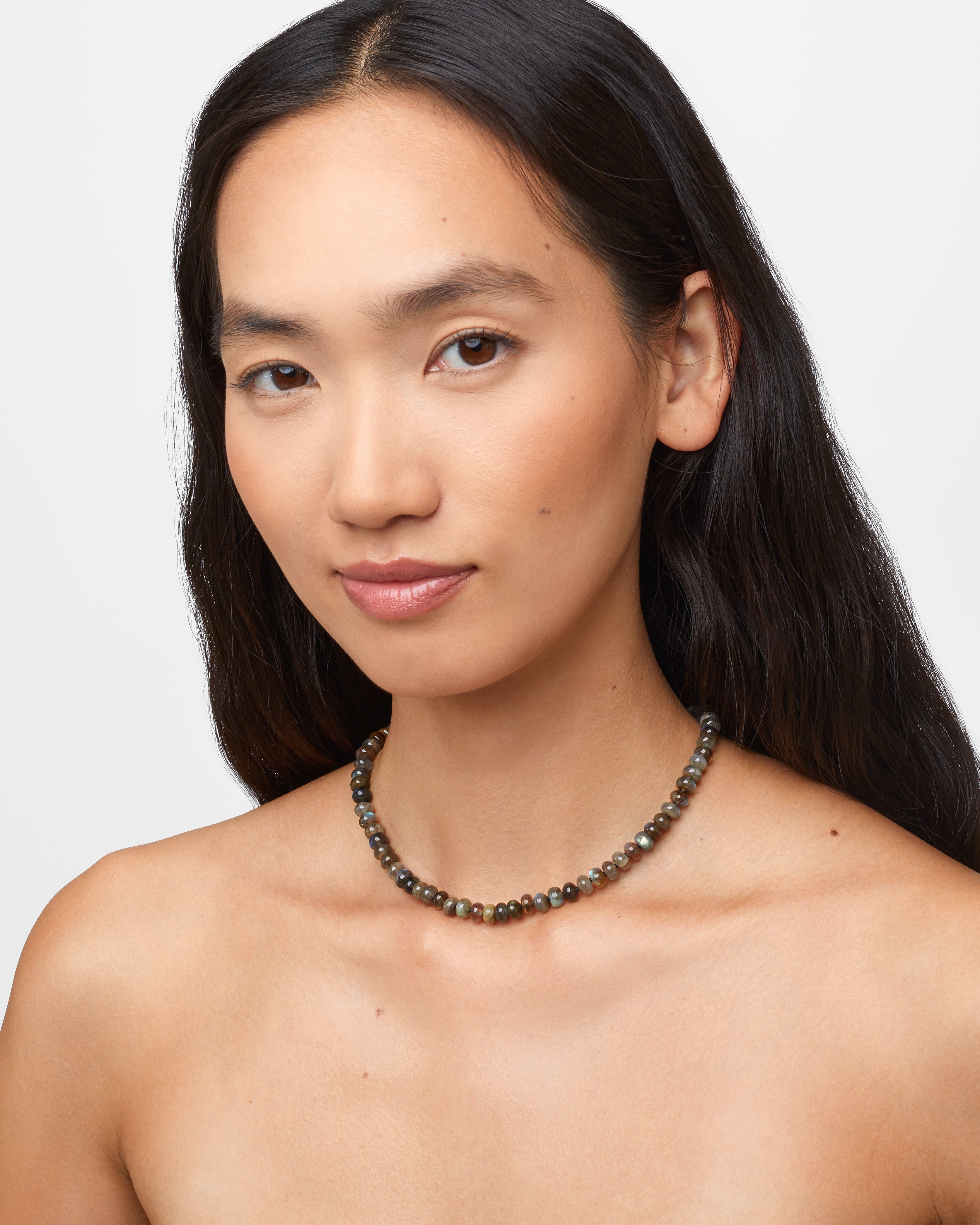 Iridescent crystal Labradorite Necklace that is hand beaded and adorned with 14 karat gold hardware and chain.