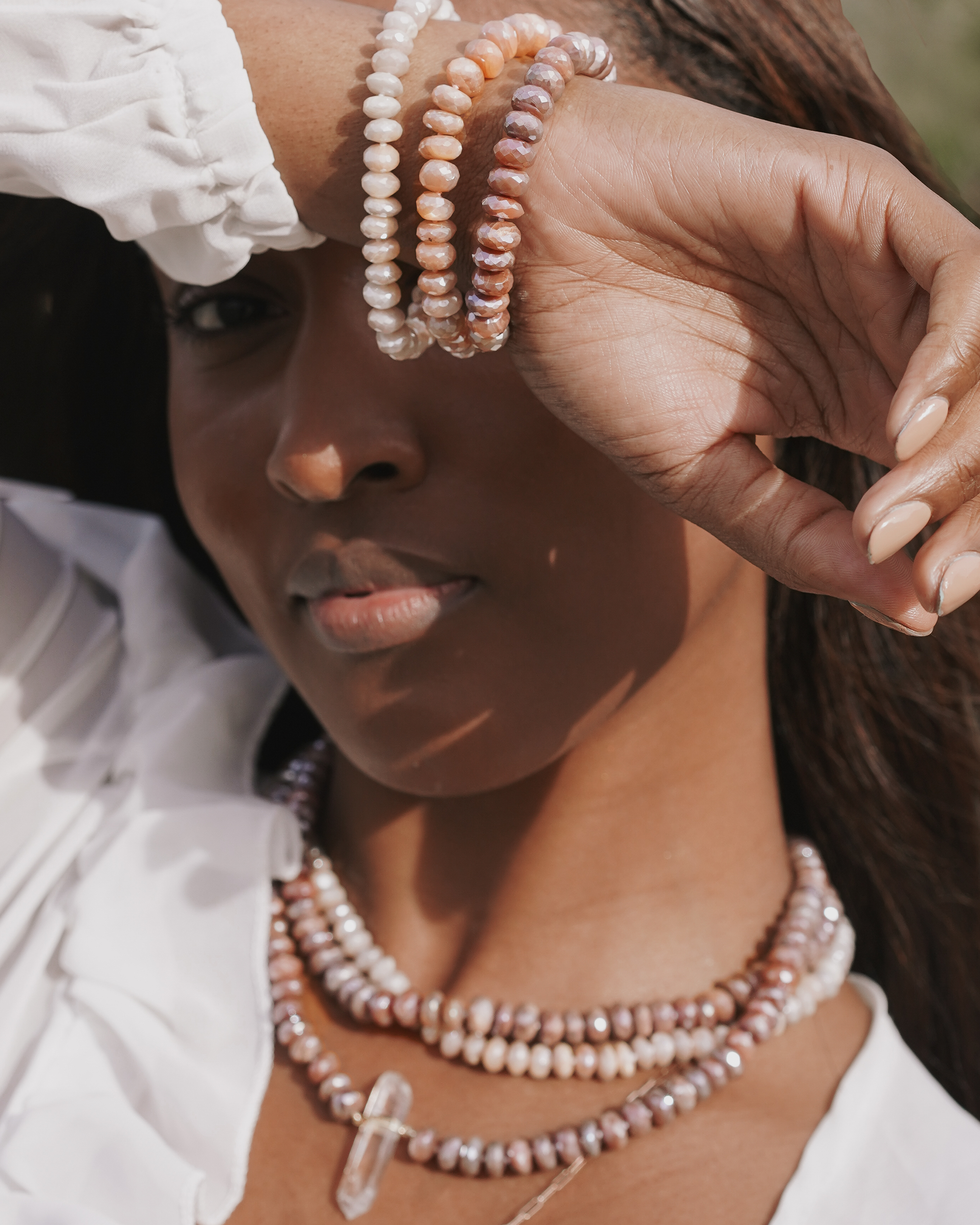 Each beaded jewelry piece is hand strung from the highest quality materials that are cut from natural mineral sources. They are sensitive to prolonged exposure to hairsprays and scents. To ensure longevity please be gentle and avoid tugging and pulling of these pieces.