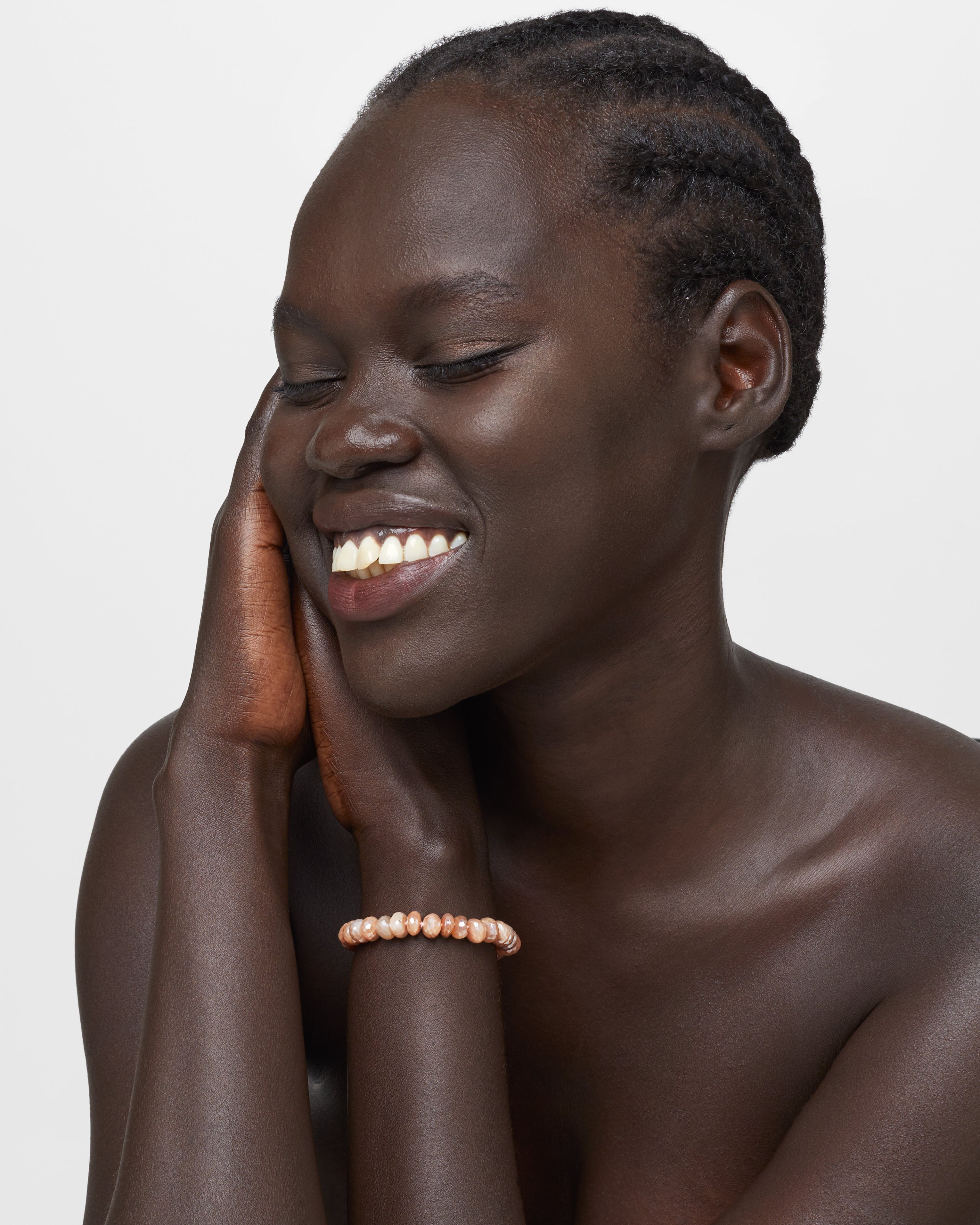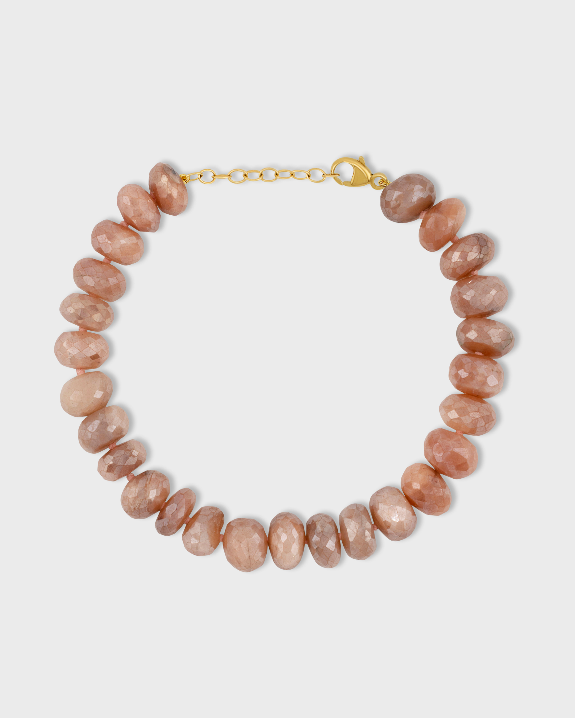 A serene peachy hued moonstone hand knotted in New York City and finished in 14 karat gold extender chain and lobster clasp.