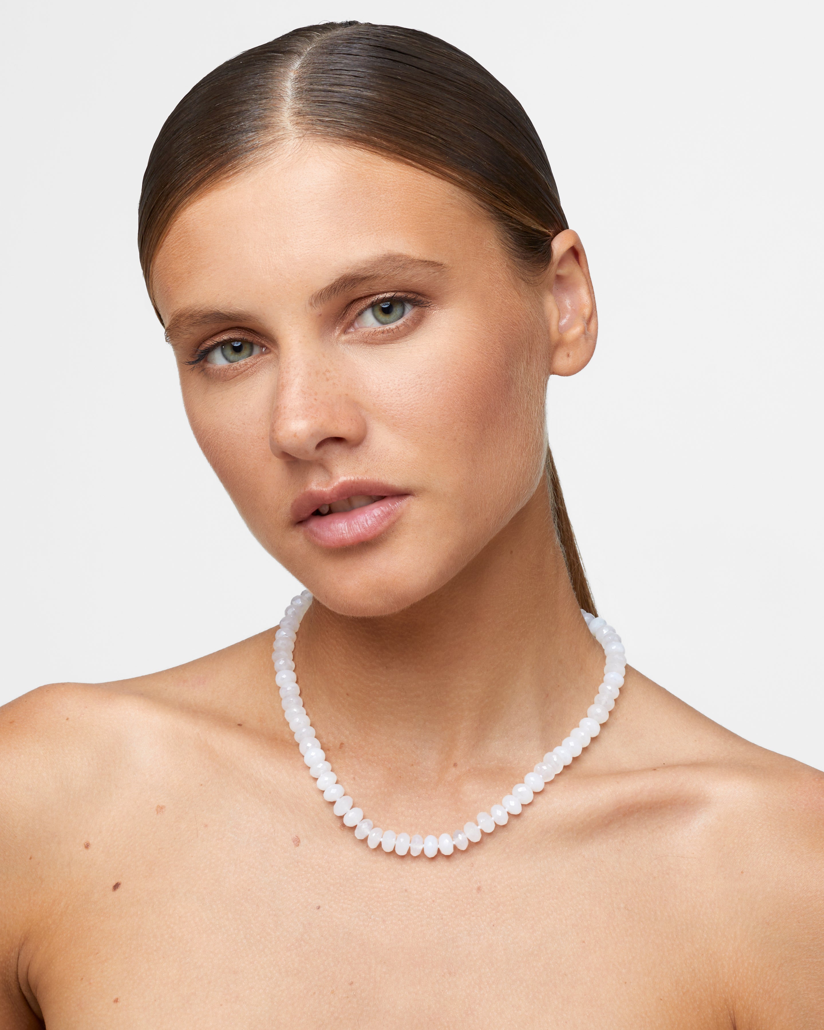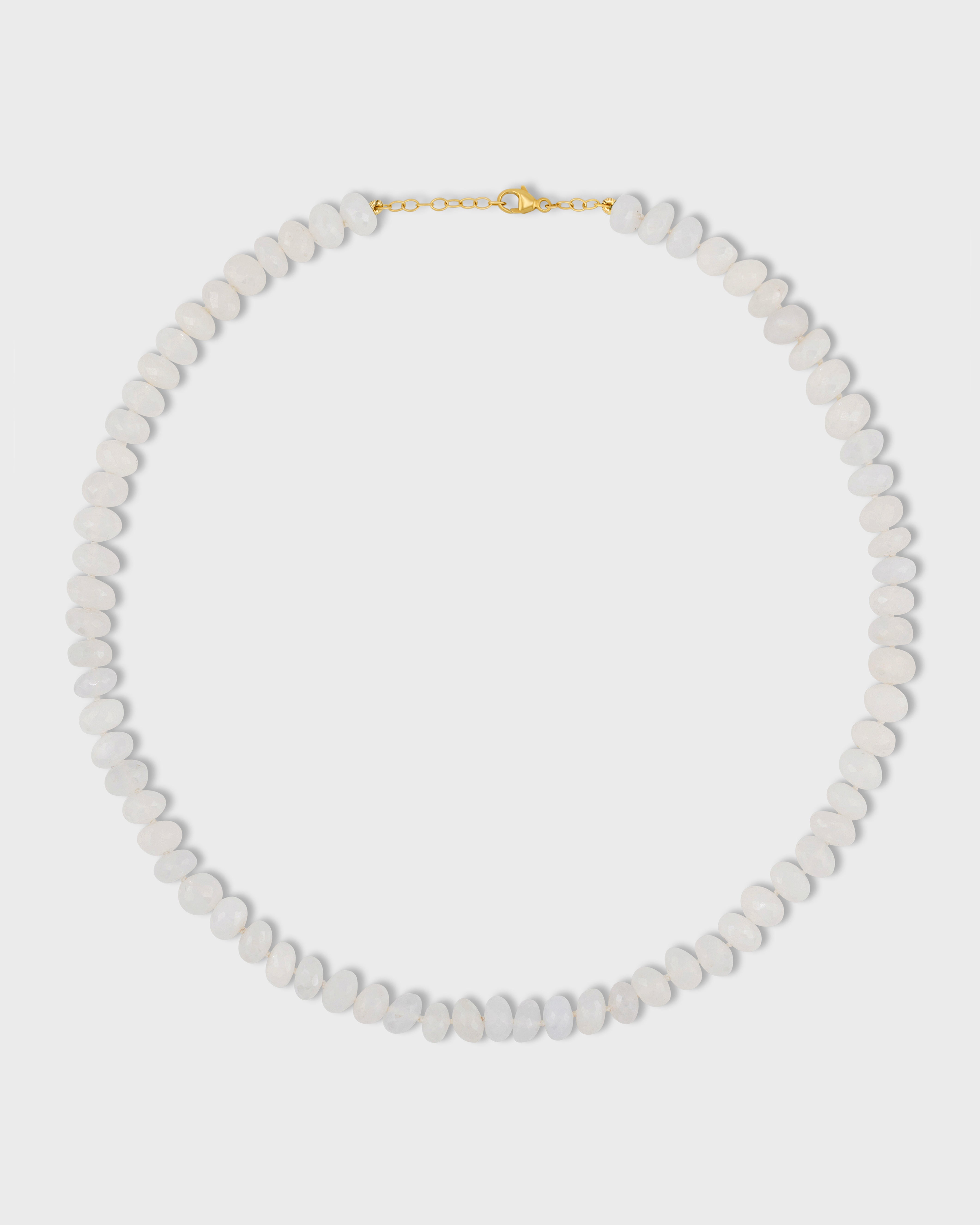 Rainbow moonstones hand strung in the heart of New York City and finished with 14 karat yellow gold.
