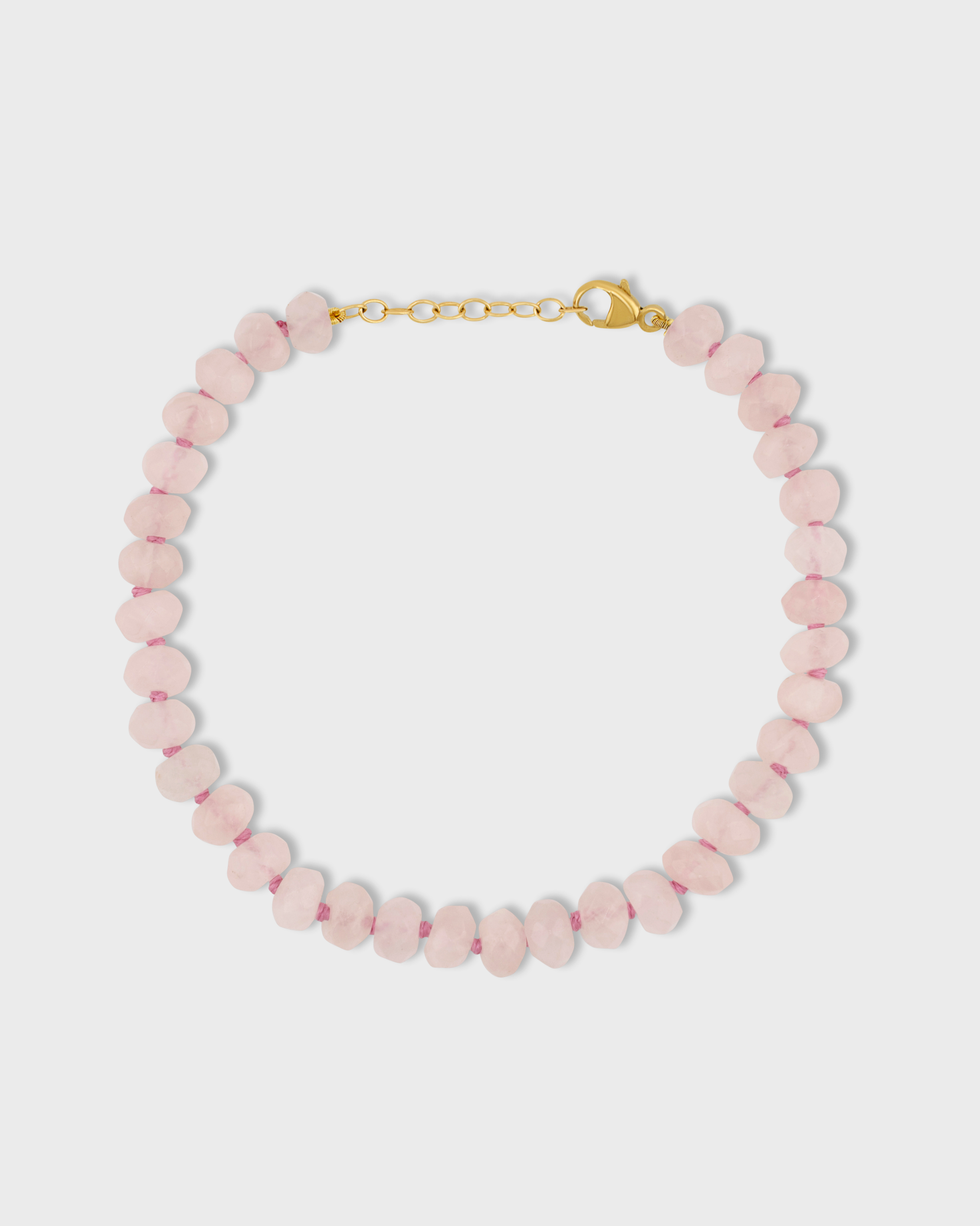 Tranquil rose quartz bracelet hand knotted and set in 14 karat gold.
