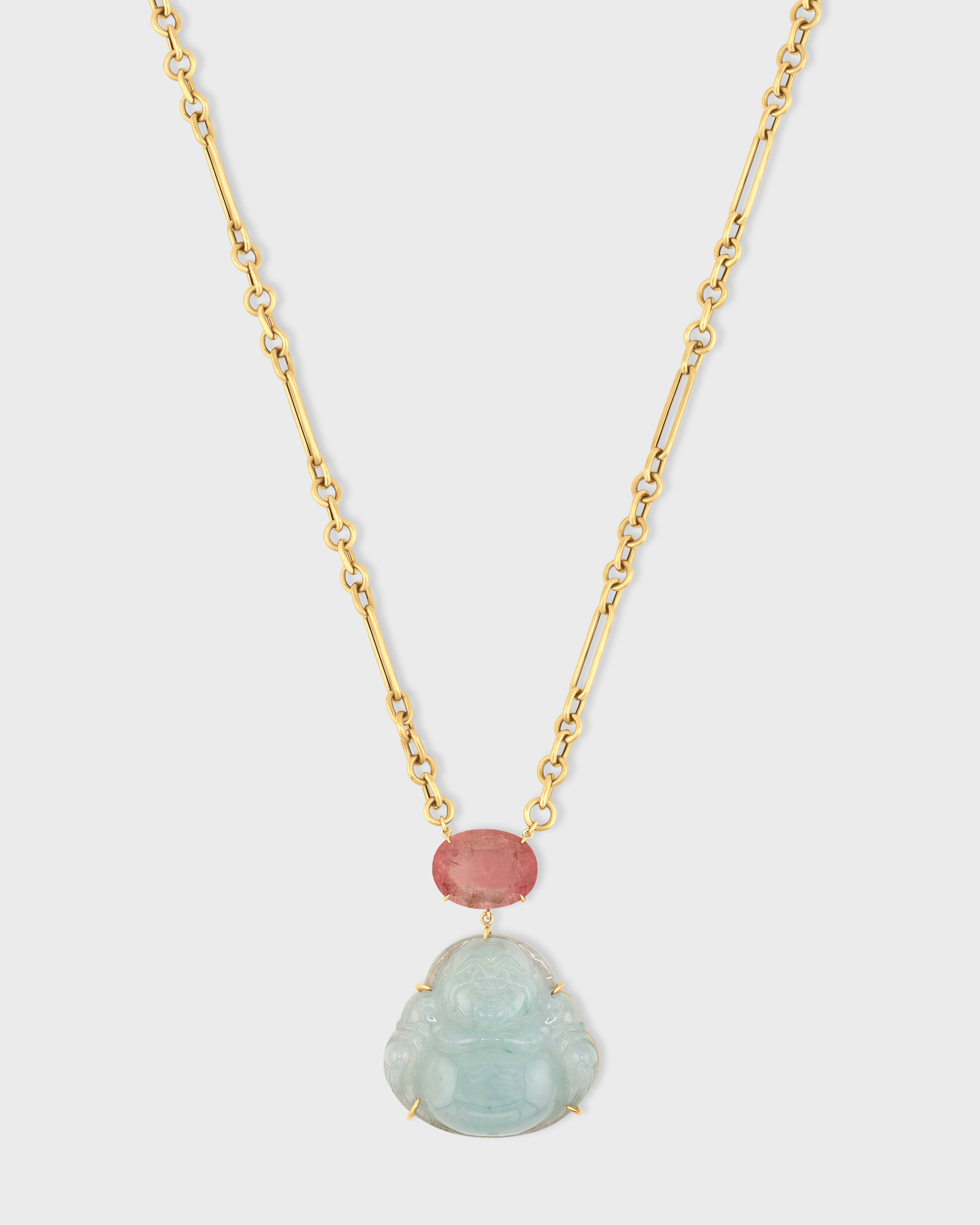This necklace features a radiant jumbo crystal quartz happy buddha with a 14k gold setting. Meticulously handmade in the heart of NYC.