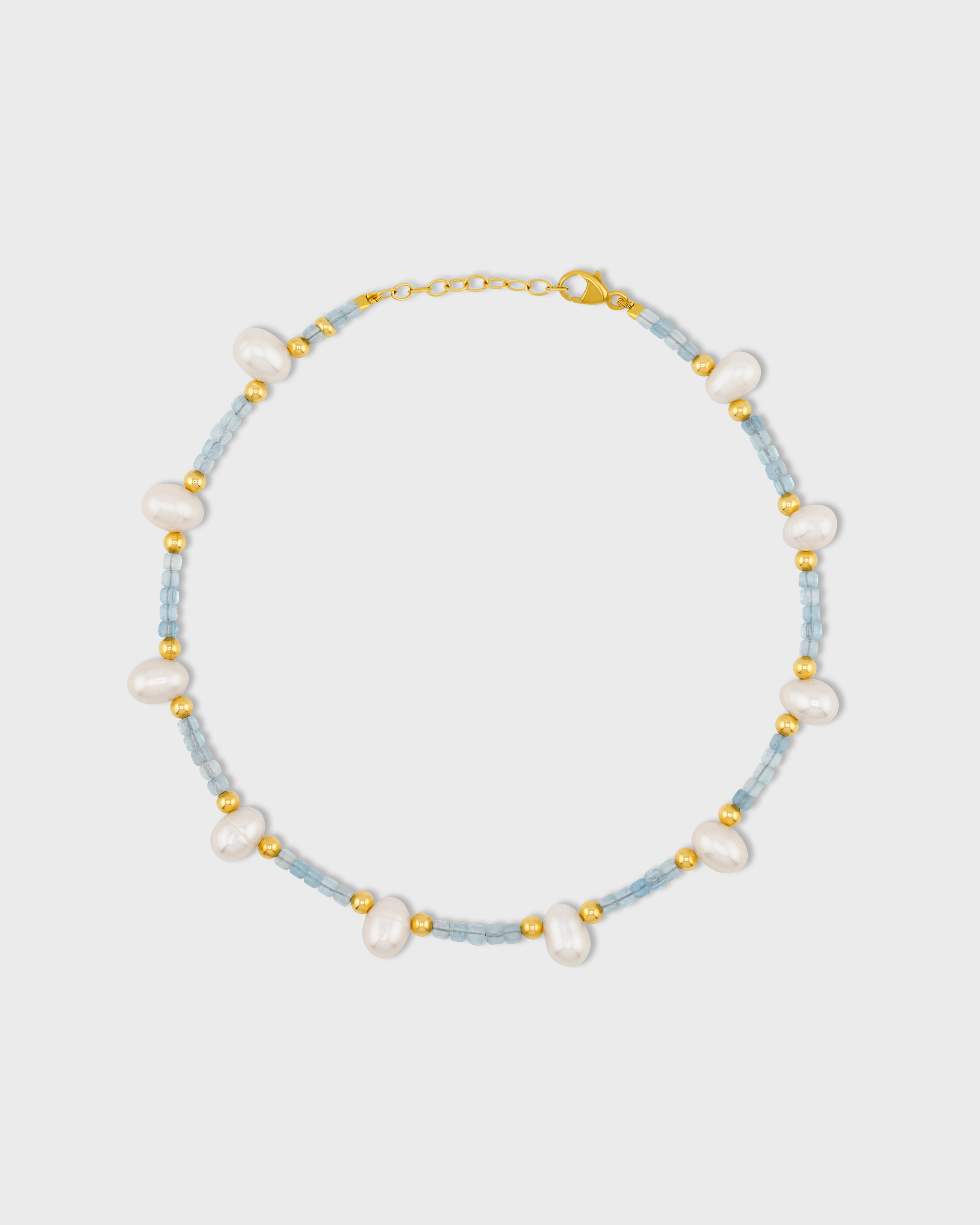 Natural aquamarine, freshwater pearls, and gold beads hand strung in the heart of New York City and finished with 14 karat yellow gold.