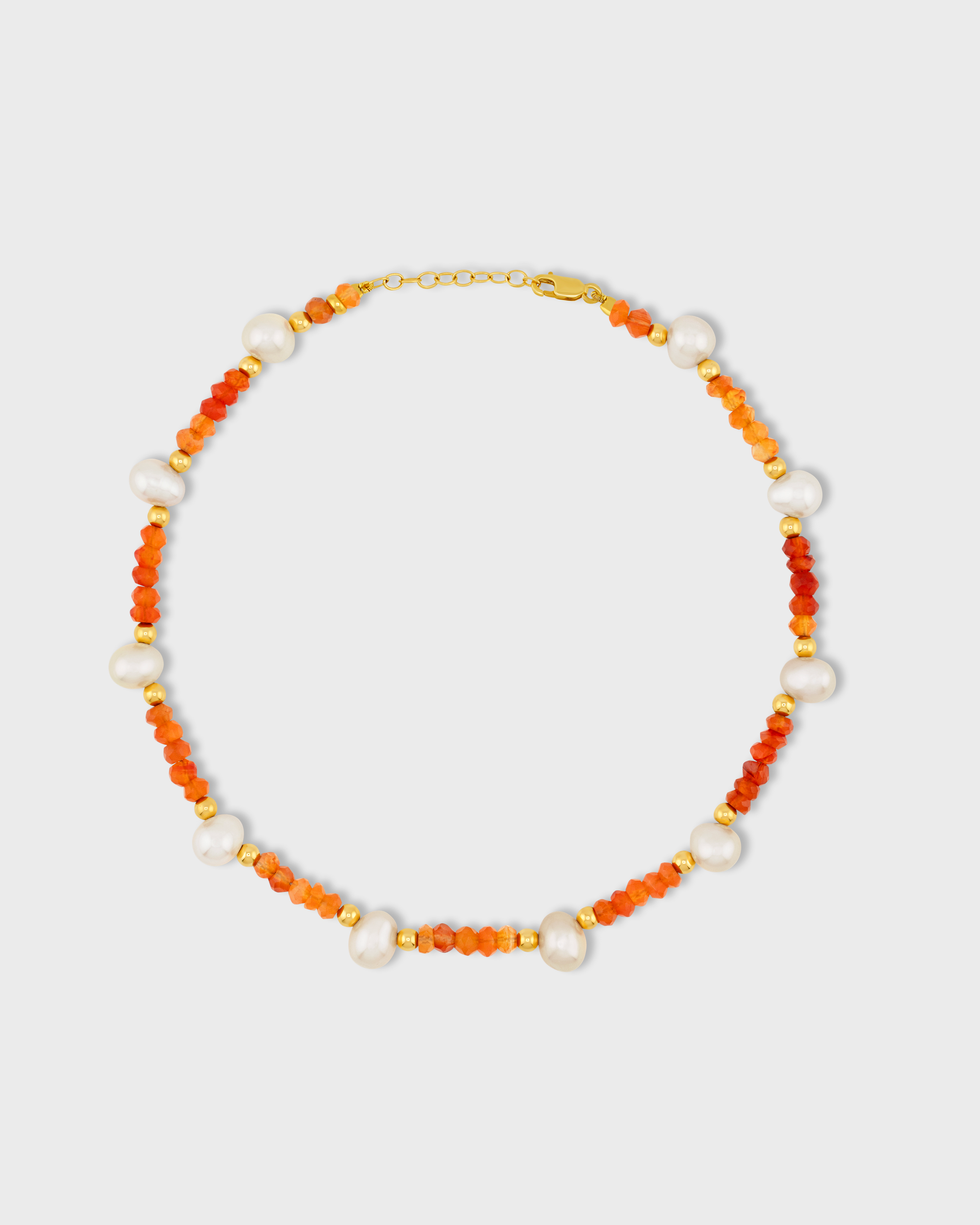 Vibrant orange carnelian crystal beads hand strung in the heart of New York City and finished with 14 karat yellow gold.