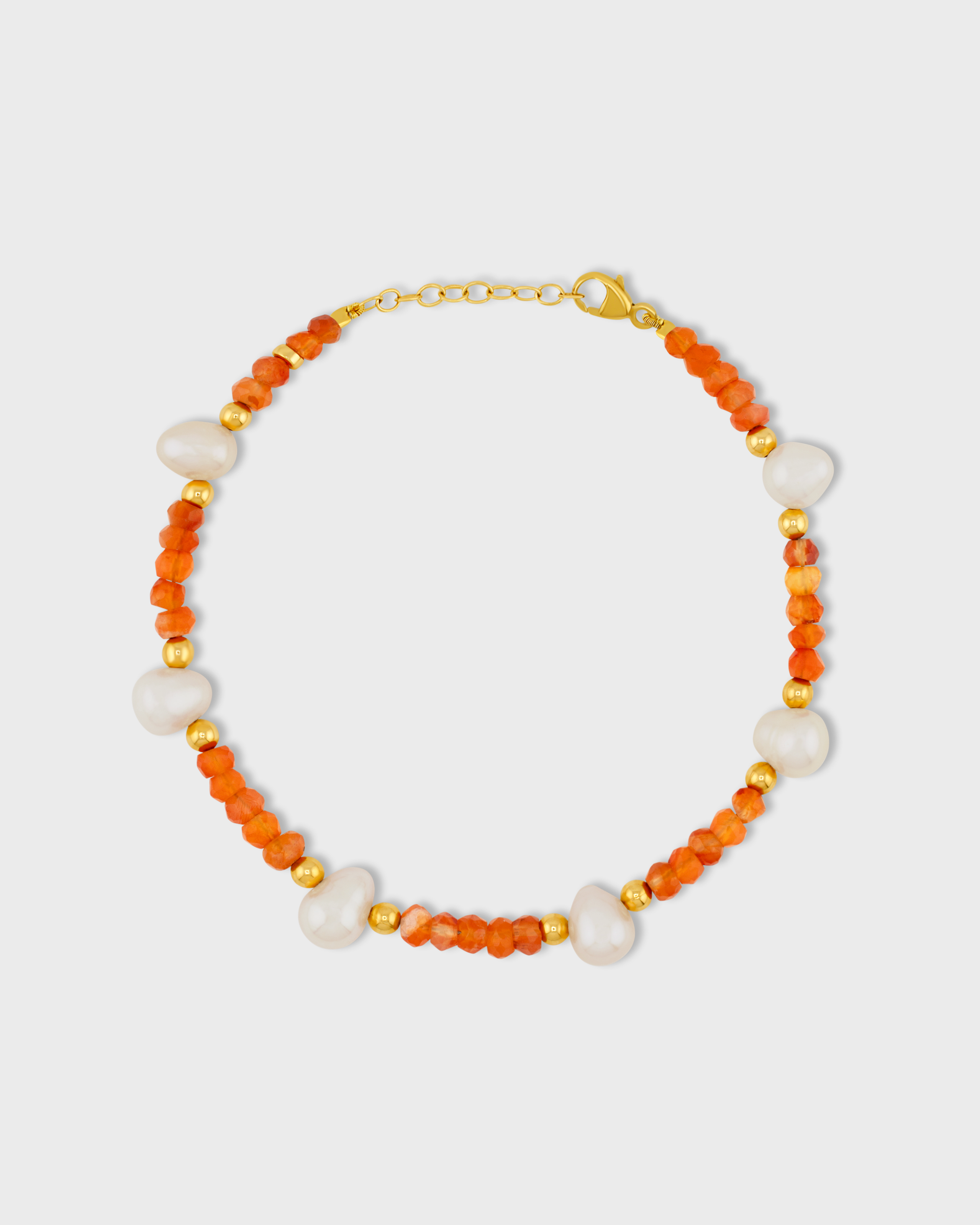 Fiery orange carnelian crystals hand strung with freshwater pearls throughout in our native New York City. This bracelet is finished with 14 karat gold.