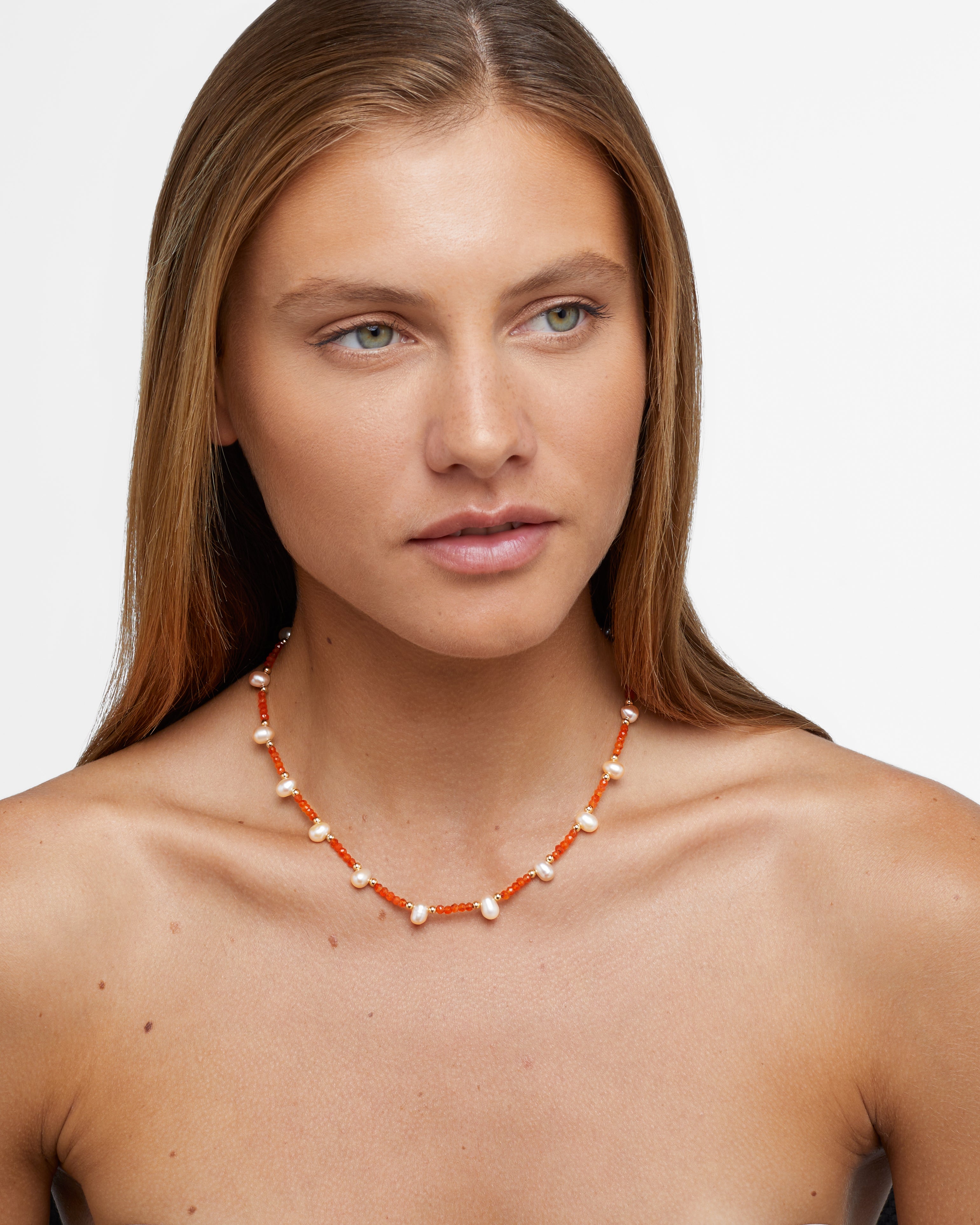 Fiery orange carnelian crystals hand strung with freshwater pearls throughout in our native New York City, finished with 14 karat gold.