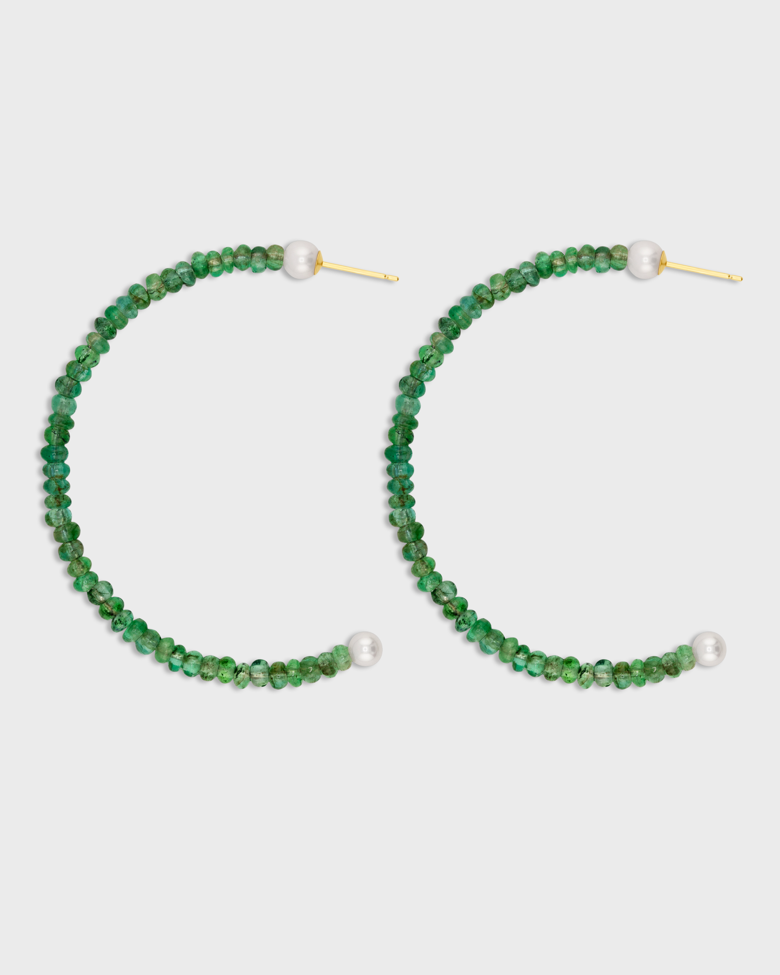 These earrings feature a lovely arrangement of small emerald green beads, forming an elegant hoop with a polished pearl on each end. The green beads, adding a touch of luxury, while the pearls on the tips bring a classic element to the design.