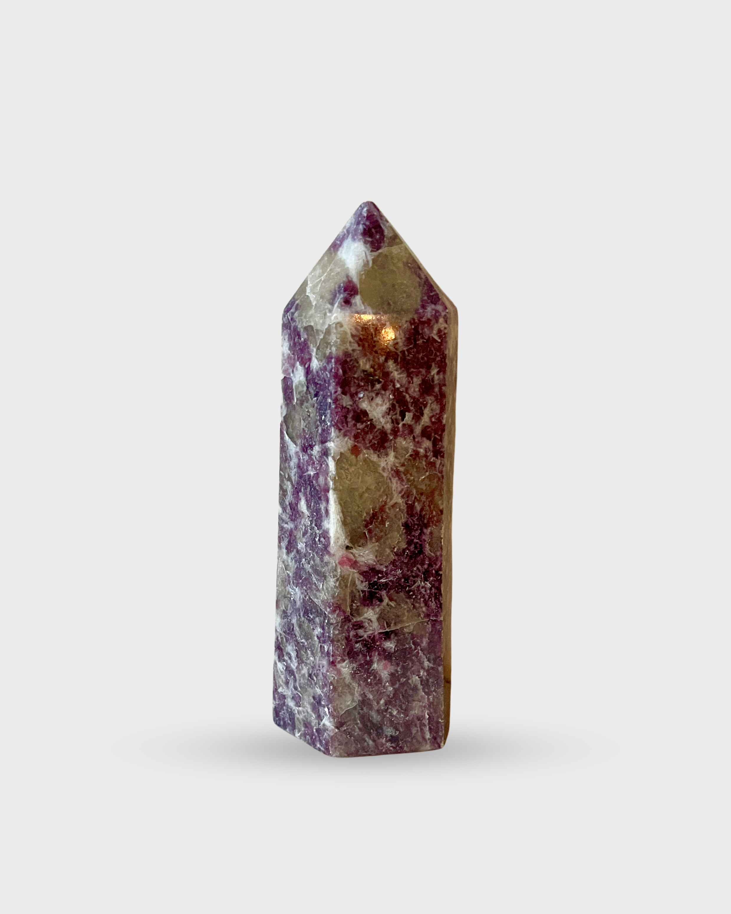 Rich lavender tones shimmer with mica in this Lepidolite tower, a stone of peace and calm reflection. A soothing addition for grounding the home and mind.