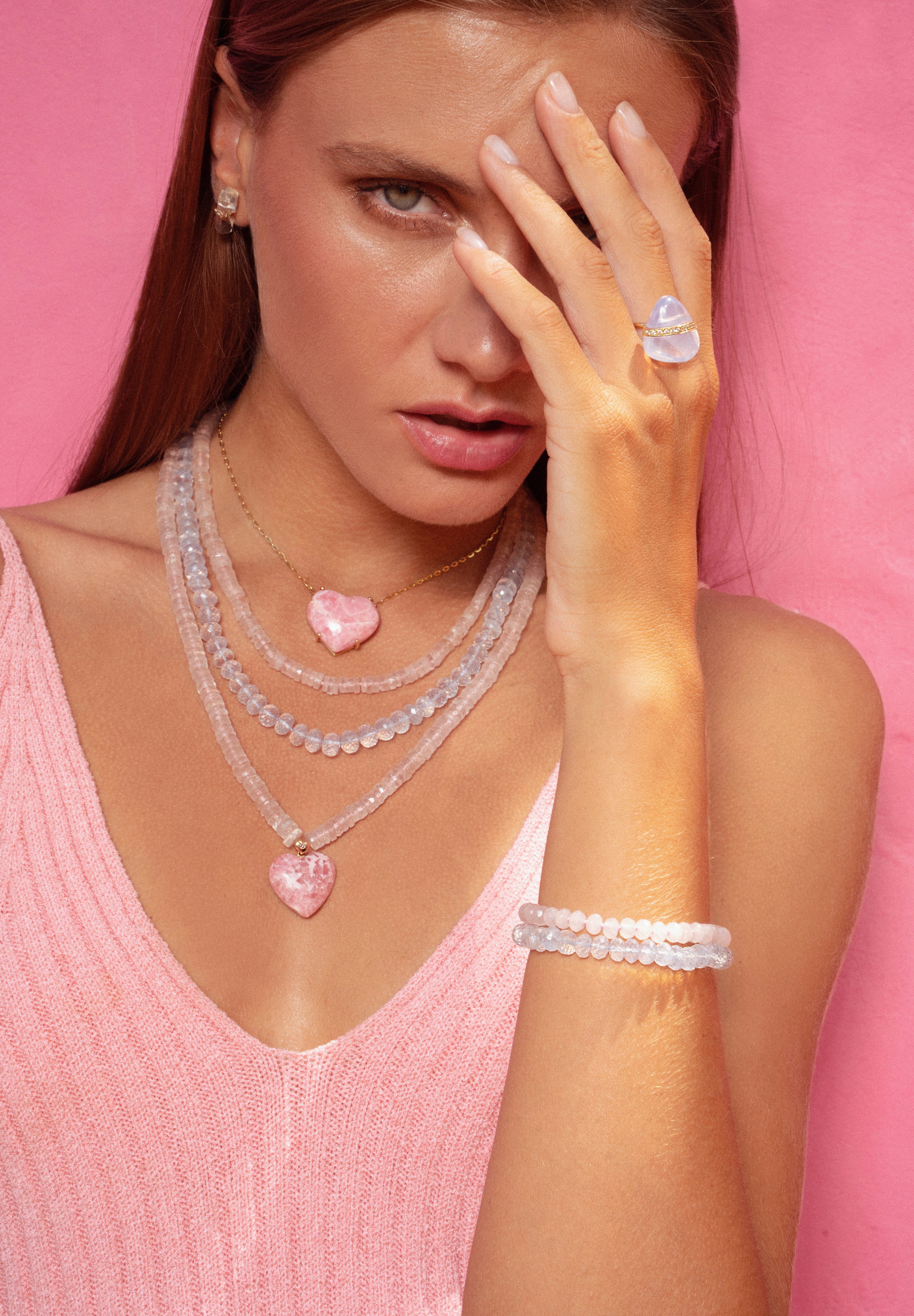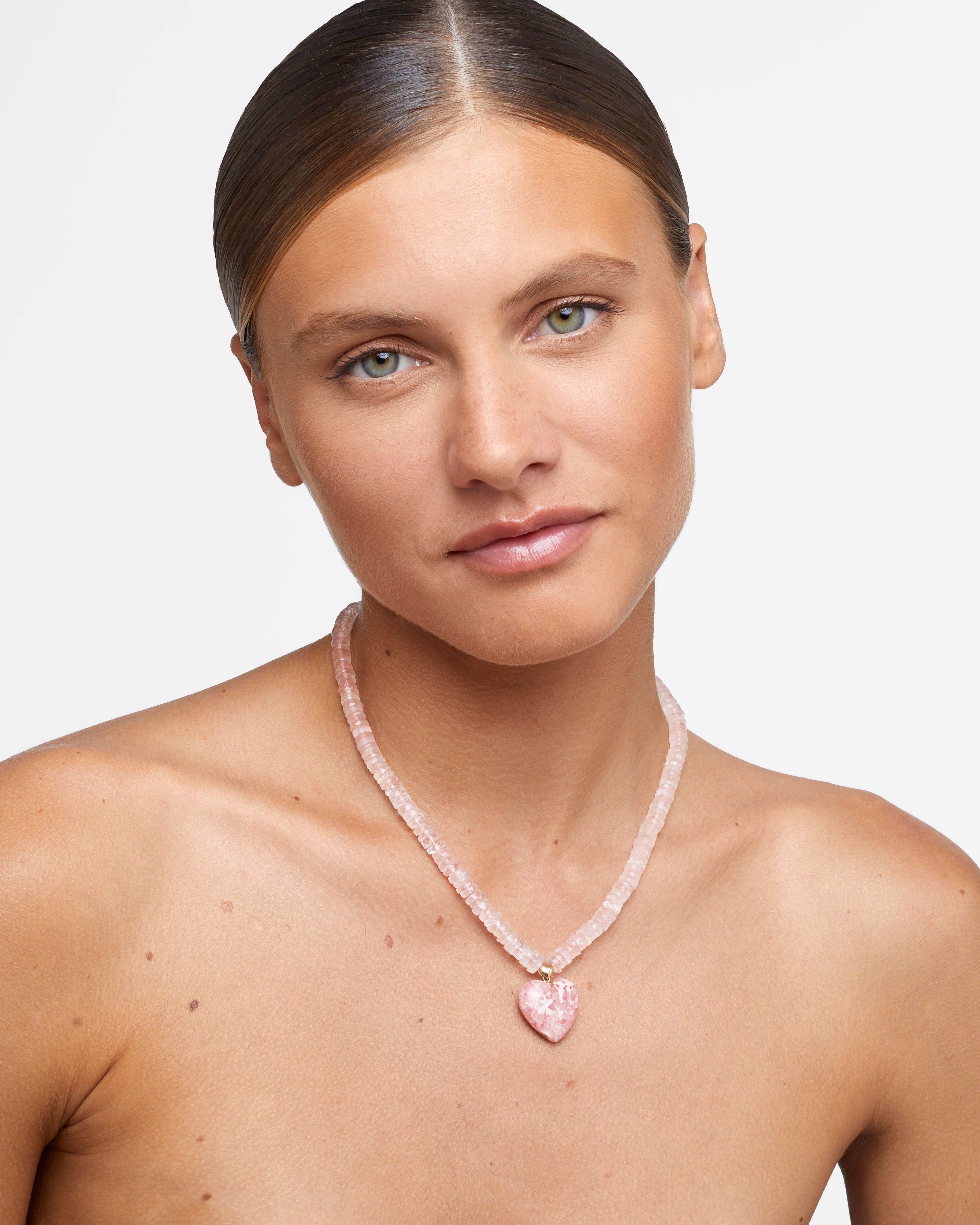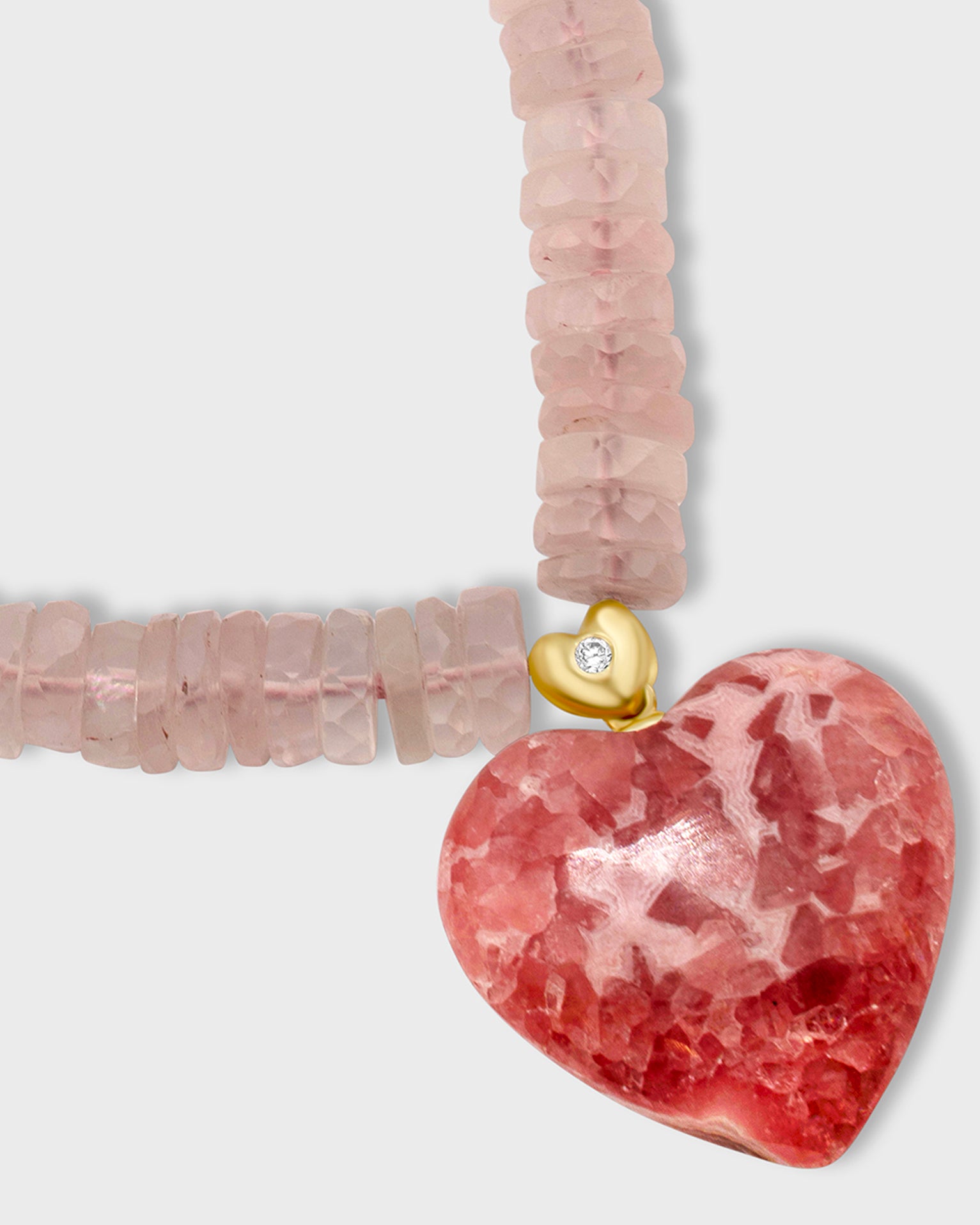 Faceted cut rose quartz crystal necklace with an exceptionally pink rhodochrosite hand carved heart and diamond heart charm. This necklace hand knotted with silk and finished in 14 karat gold in our native New York City workshop.