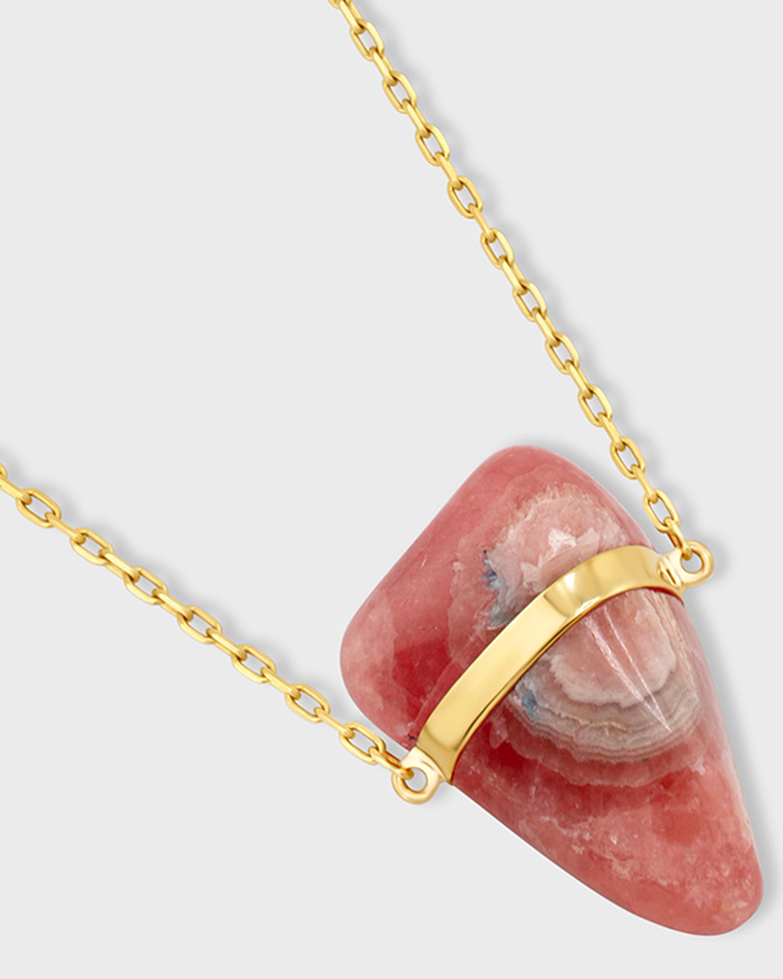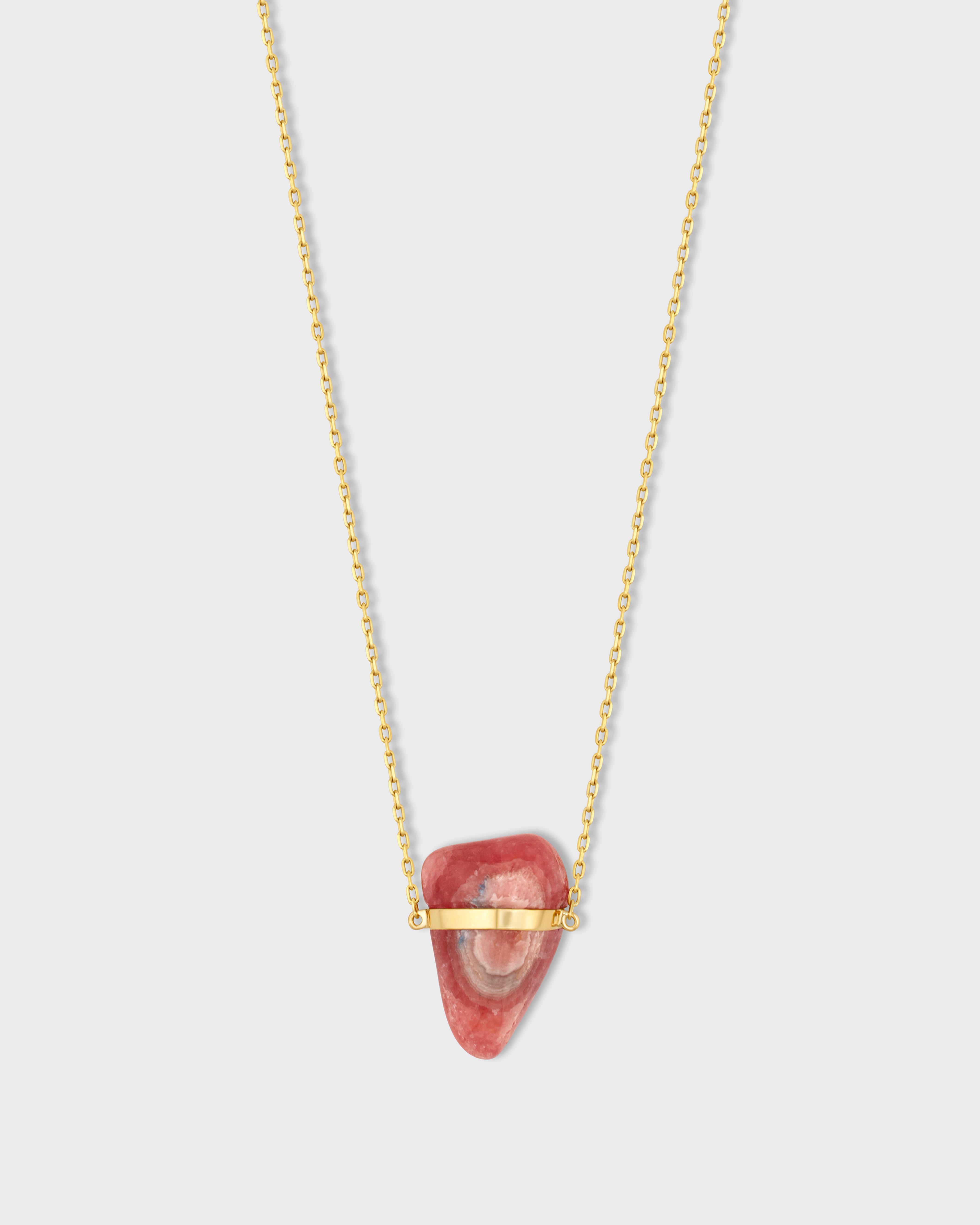 The exquisite gemstone necklace features a polished slab of Rhodochrosite, known as the "Stone of Love and Balance" for its warm pink hue that radiates compassion. Suspended from a 14k gold chain handcrafted in New York City, this elegant necklace allows the mesmerizing patterns and color of the Rhodochrosite to take center stage. Treat yourself or a loved one to this meaningful necklace that elegantly accents your style while connecting you to the healing energy of the earth.