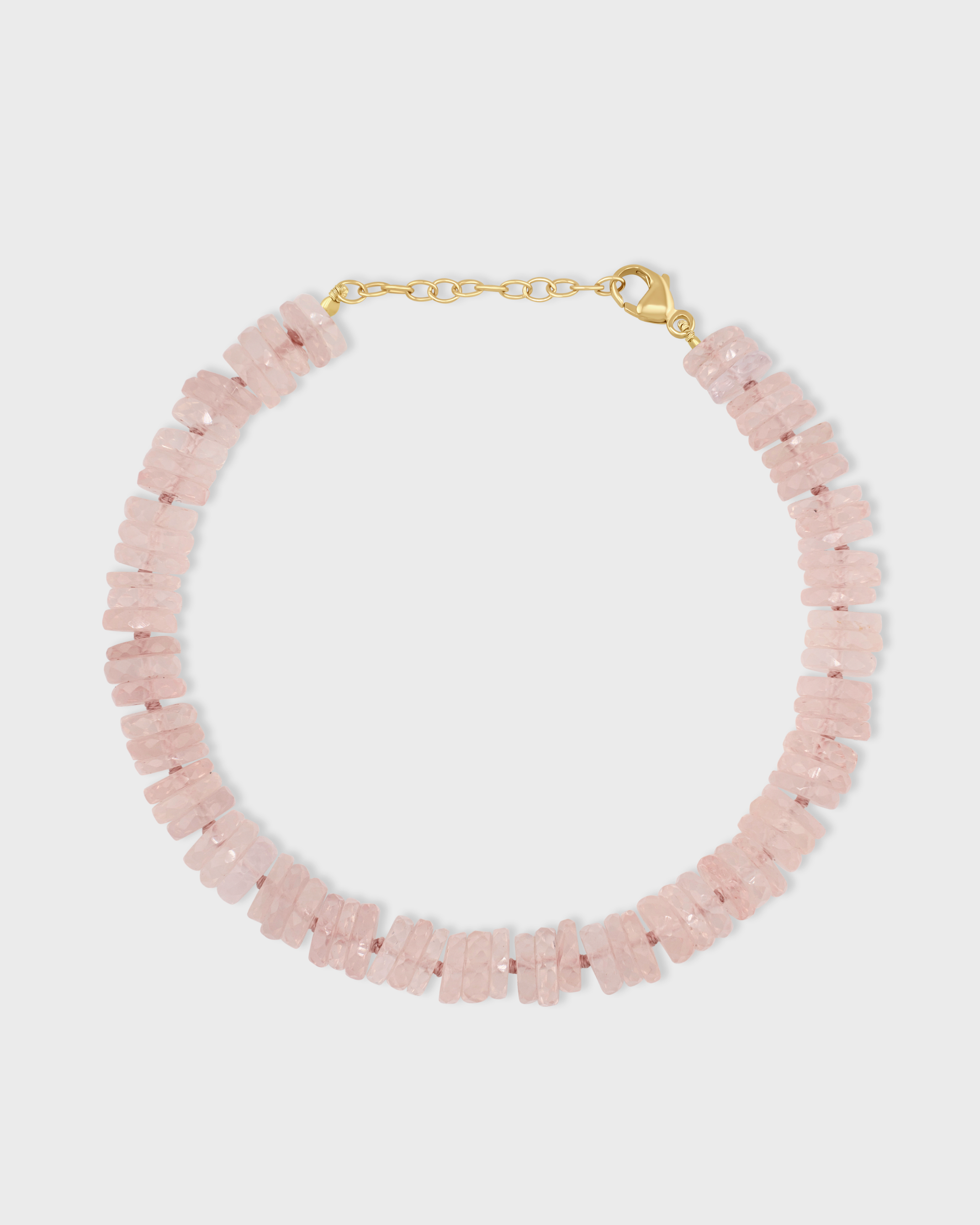Faceted cut rose quartz crystal hand knotted and finished in 14 karat gold in our native New York City workshop.