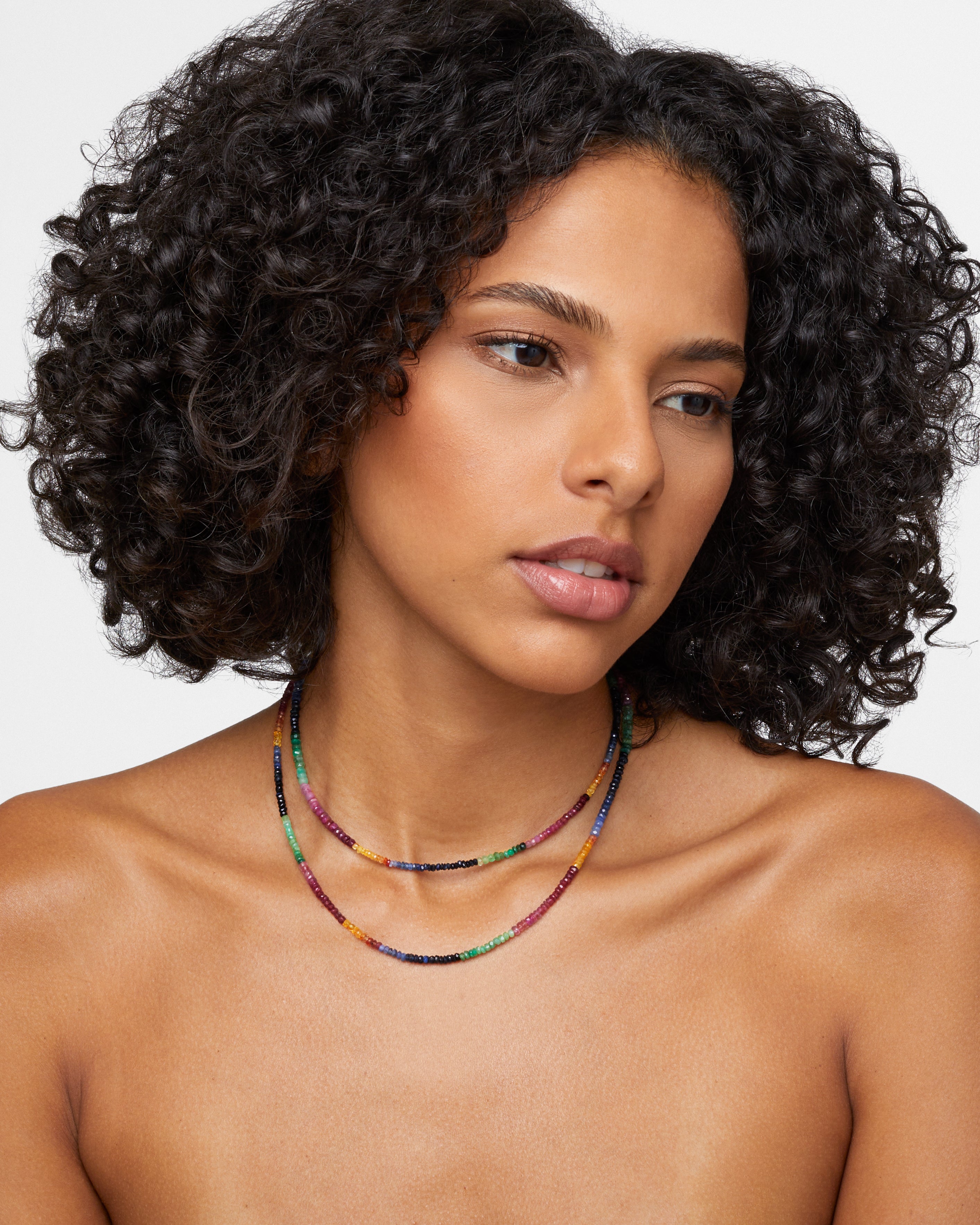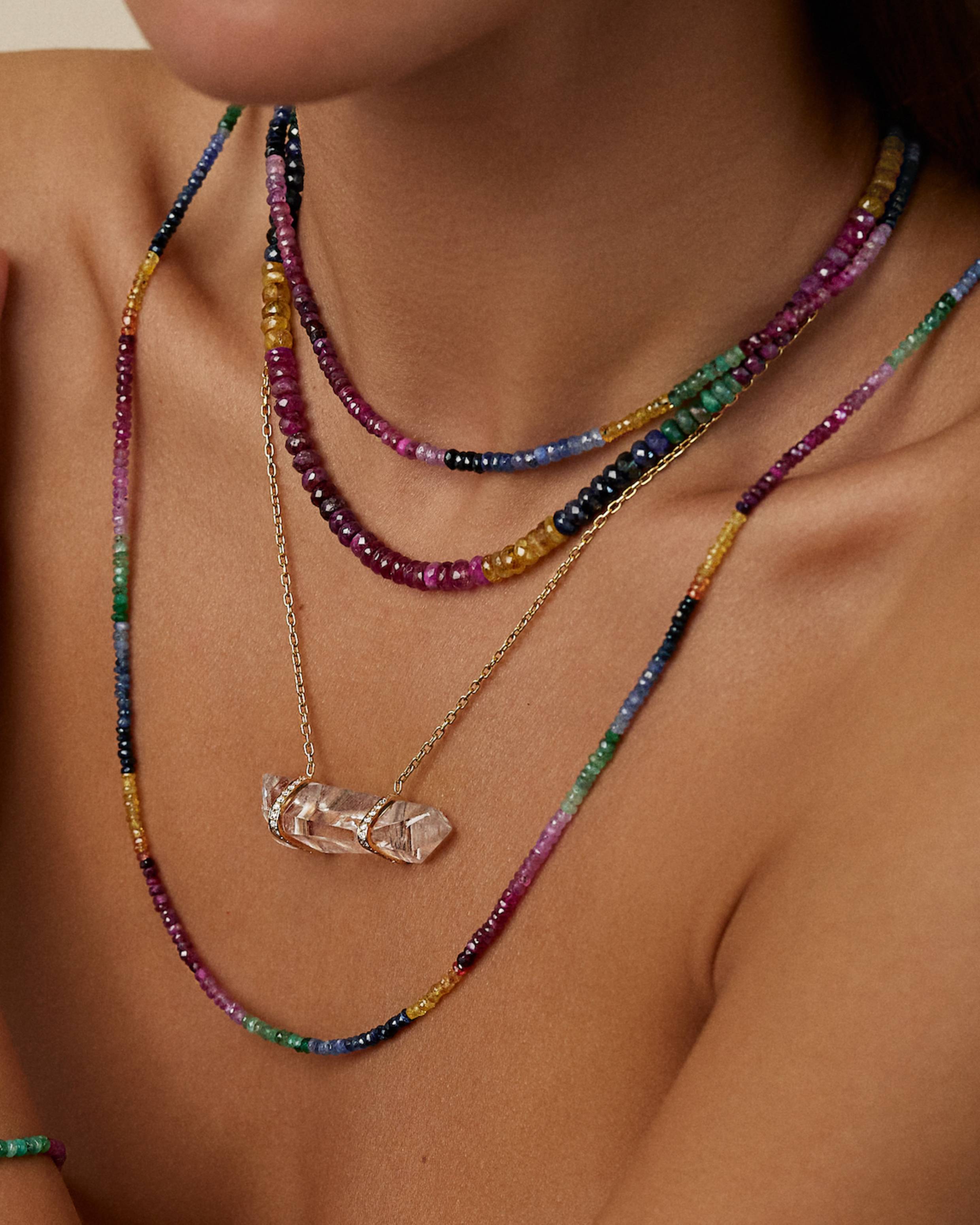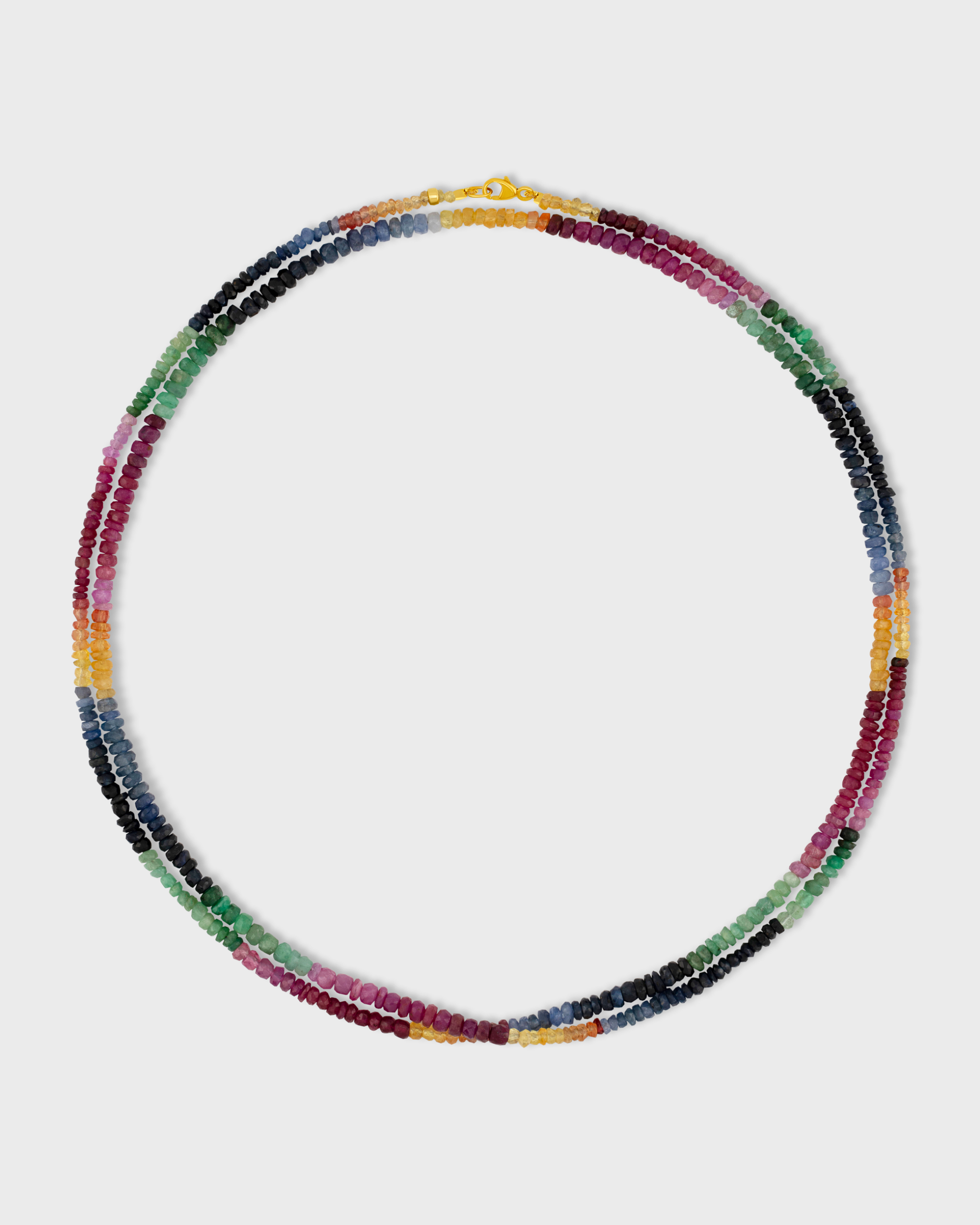 Long Rainbow Sapphire necklace with 14 karat gold. It can be worn doubled up for the effect of two necklaces or as one long strand. Perfect for any day to bring some joy and rebalancing to our lives.