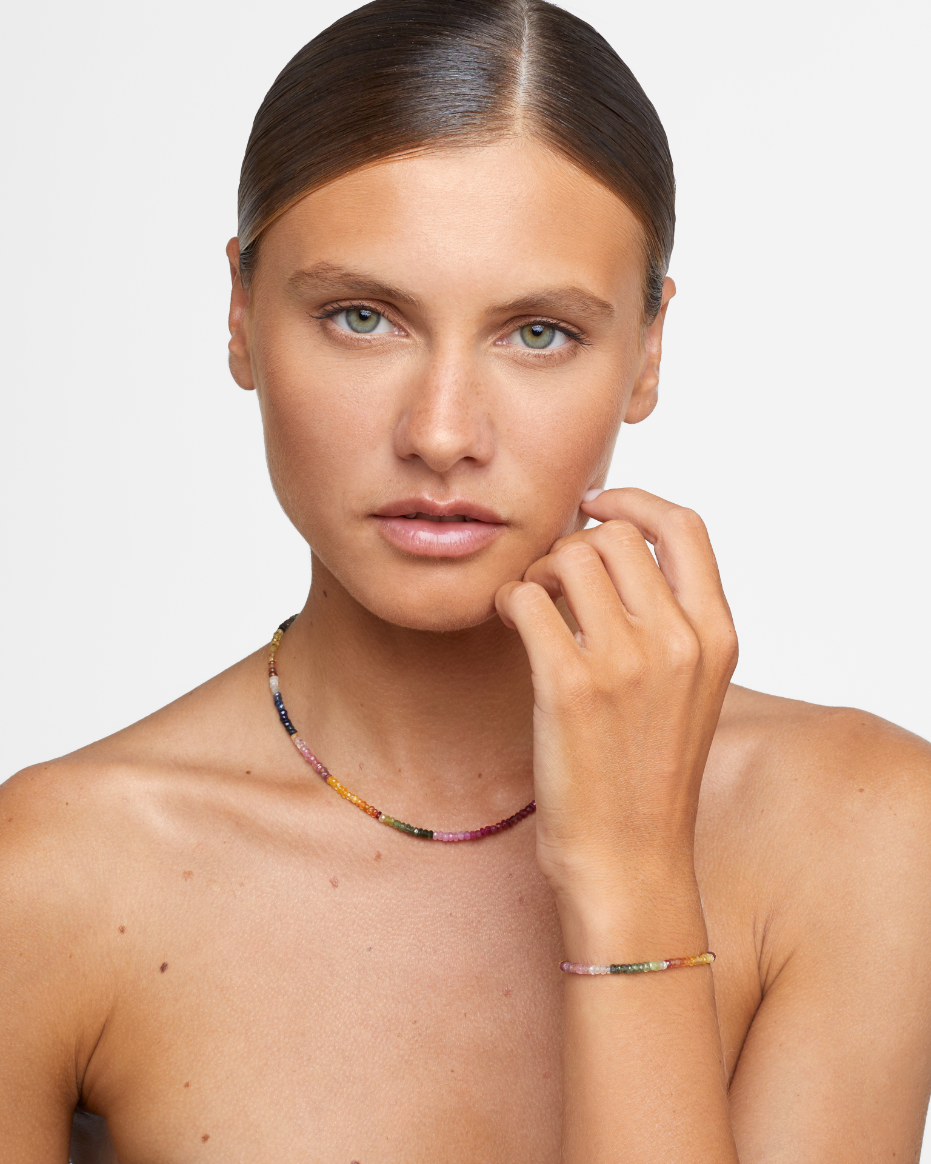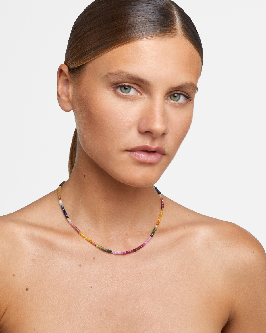 Light Rainbow Sapphire necklace with 14 karat gold brings together the vibrant natural colors of our earth. Perfect for any day to bring joy and rebalancing to our lives.