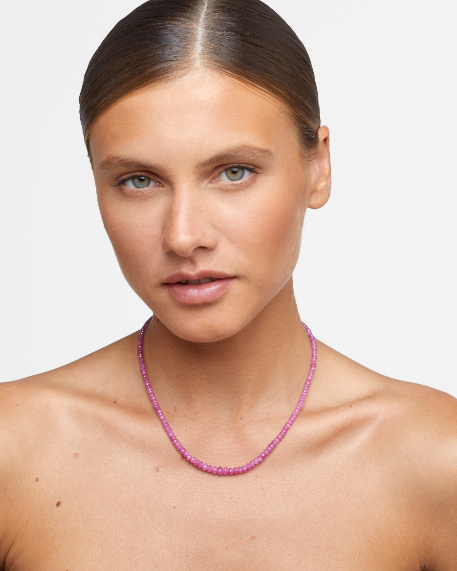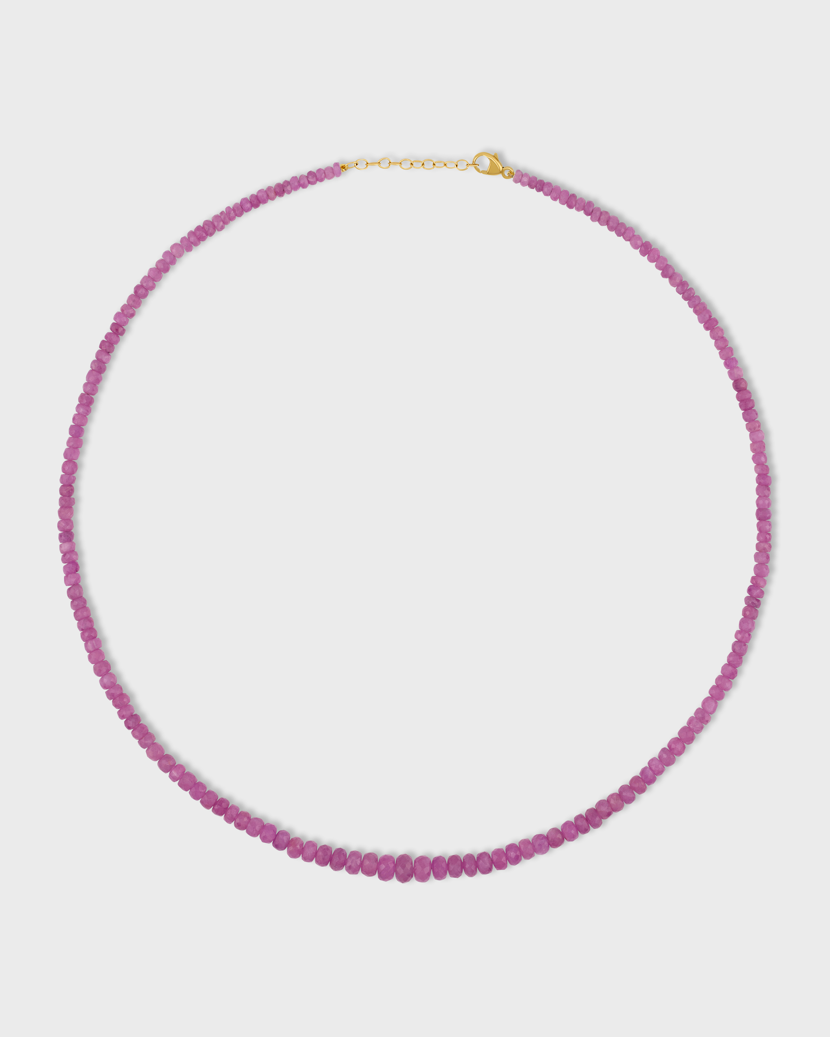 Pretty pink sapphire necklace bringing love, strength, and cheer to any day. Hand strung in New York City and finished with 14 karat gold.