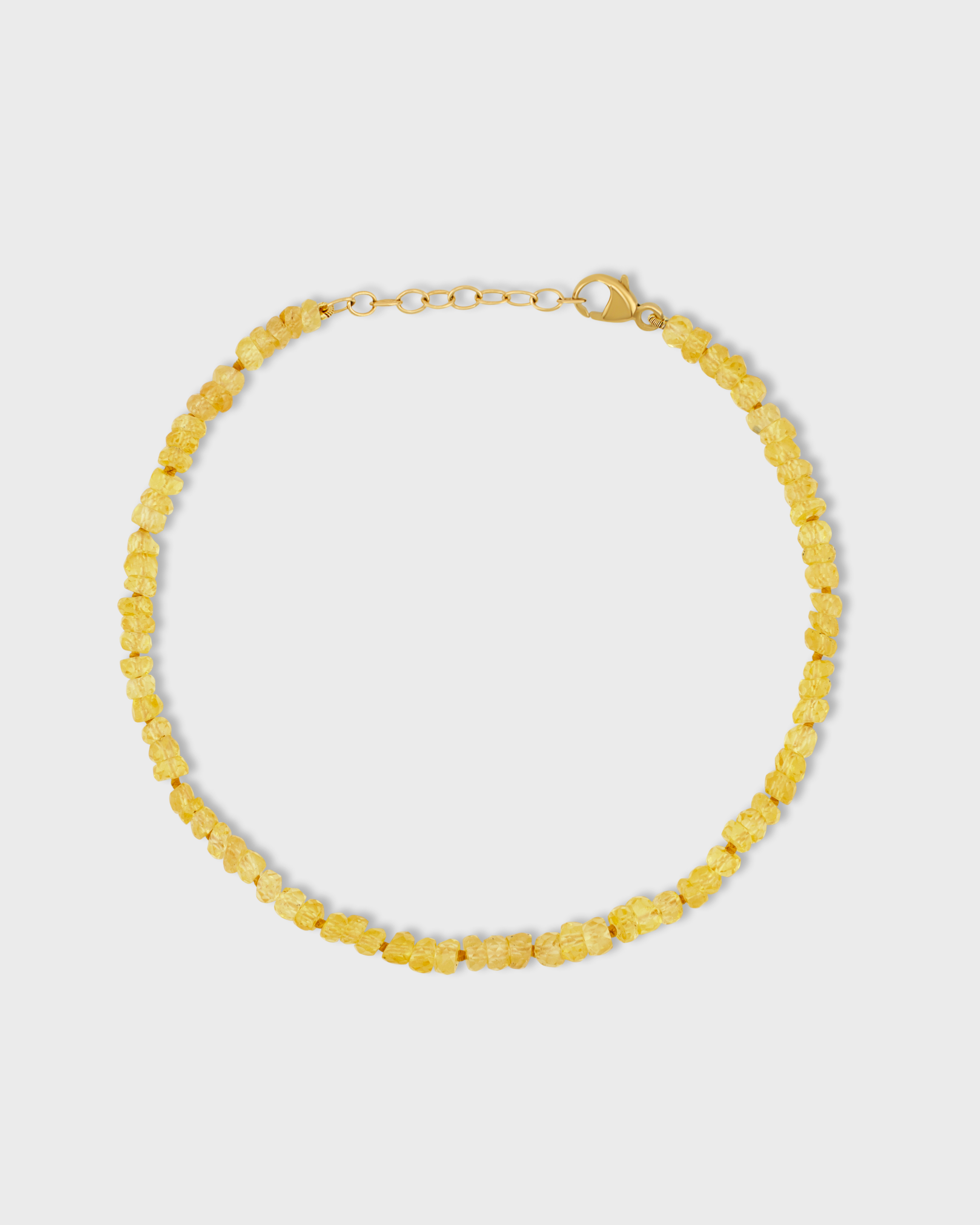 Lemon yellow sapphire bracelet with to attract prosperity and good luck. Hand strung and finished with 14 karat gold in NYC.