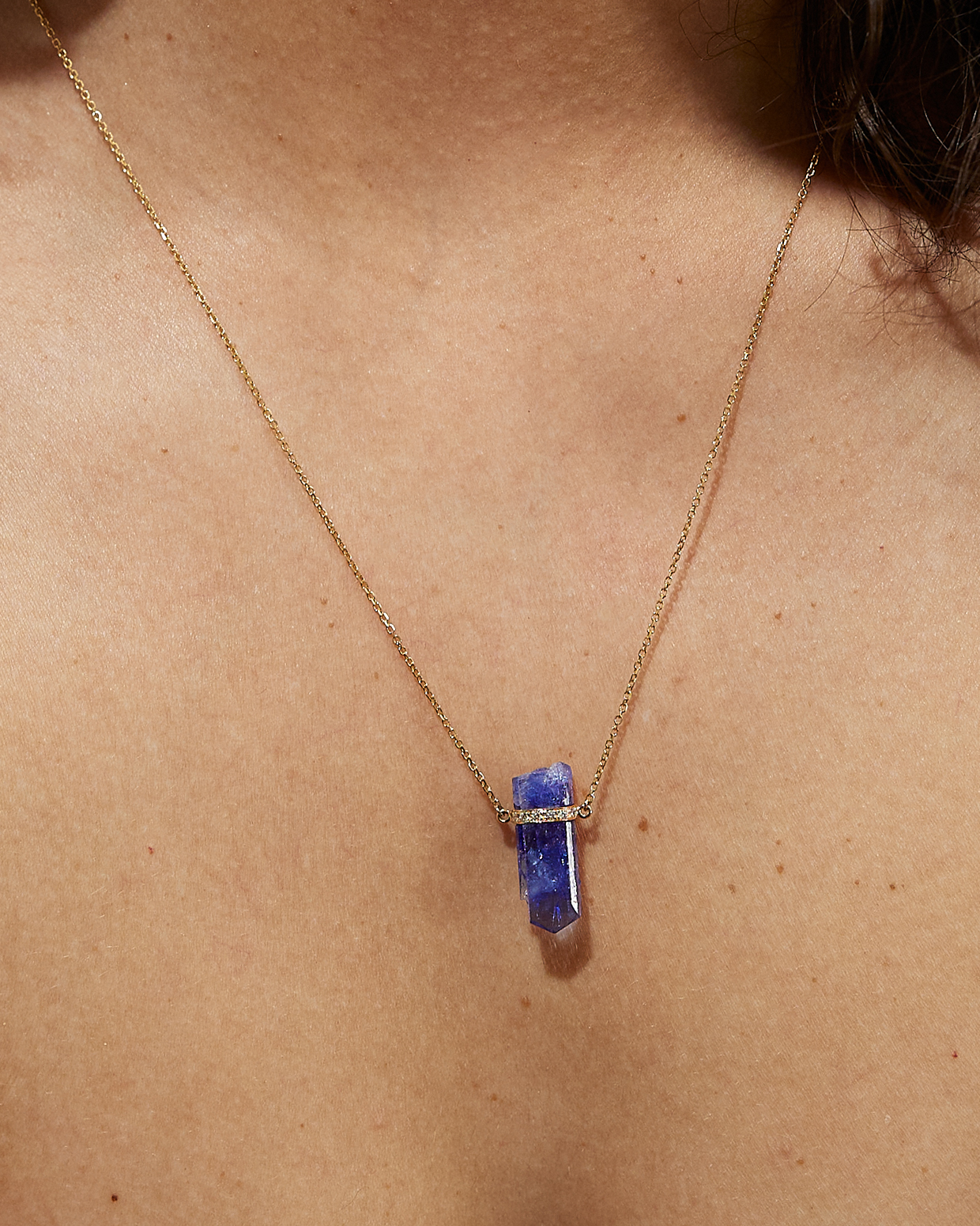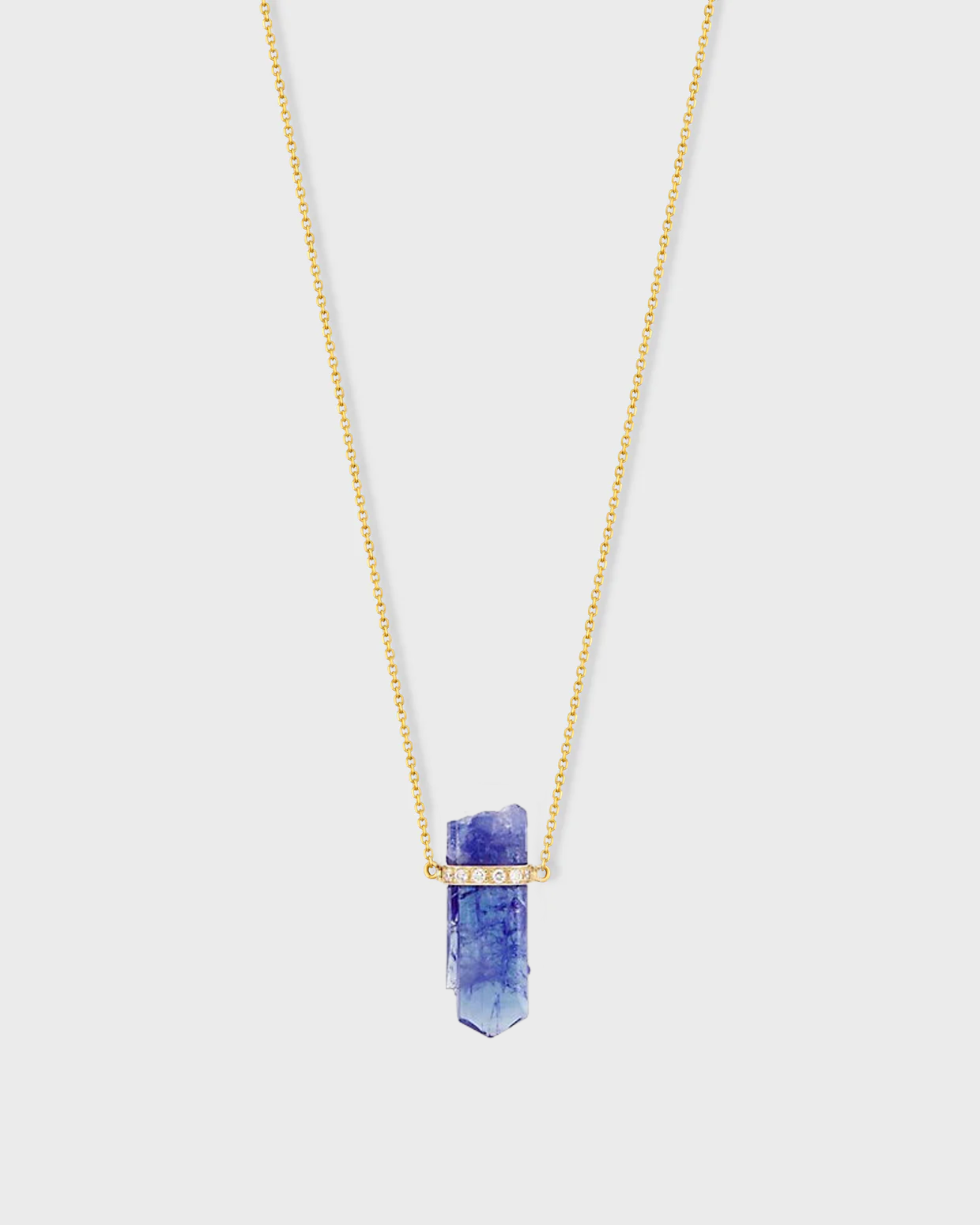 Vibrant raw tanzanite gemstone set in diamonds and 14 karat yellow gold.