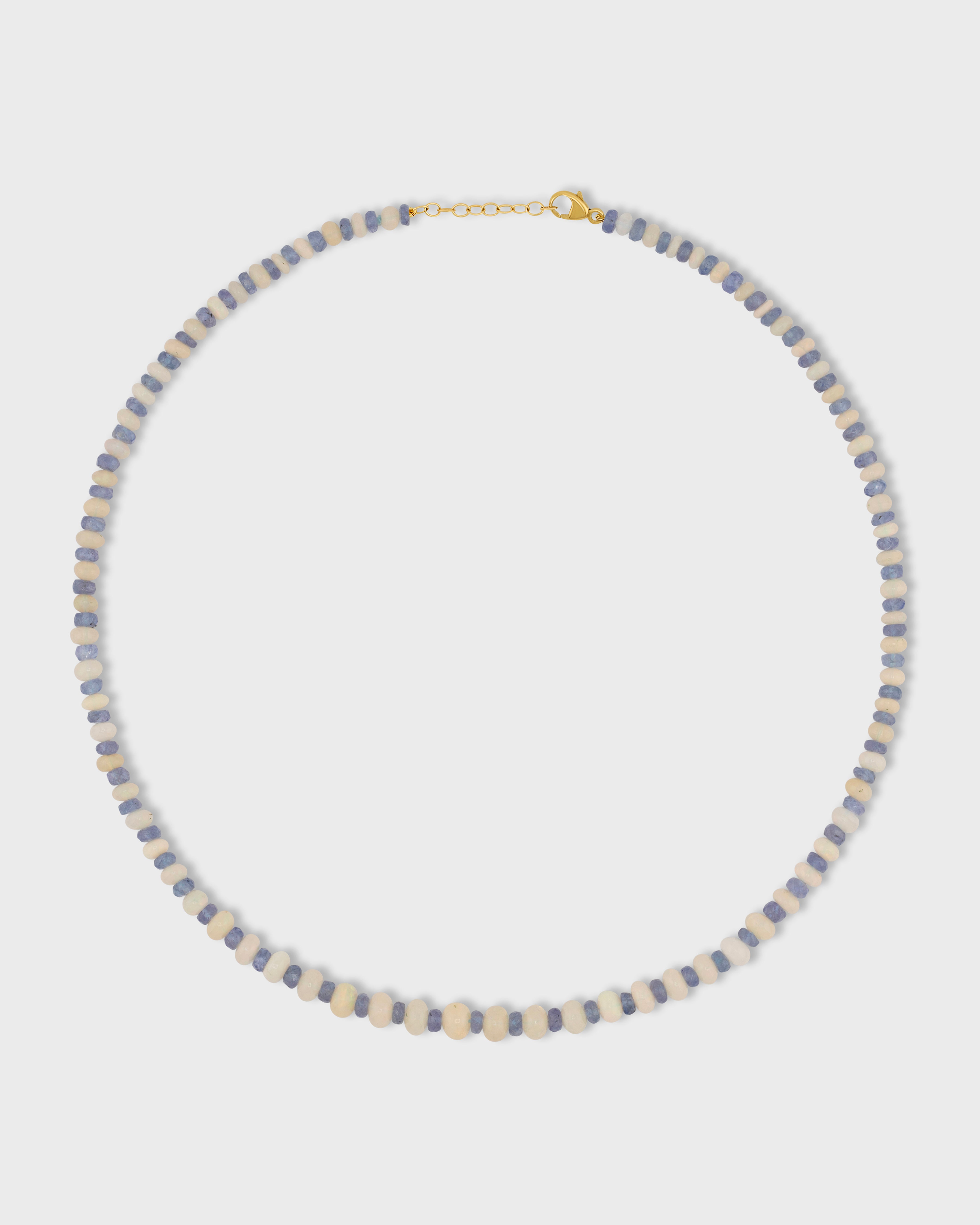 Iridescent opal paired back to tanzanite crystals. The paired crystals bring out the best colors between each other. Hand beaded in NYC and finished in 14 karat gold hardware.