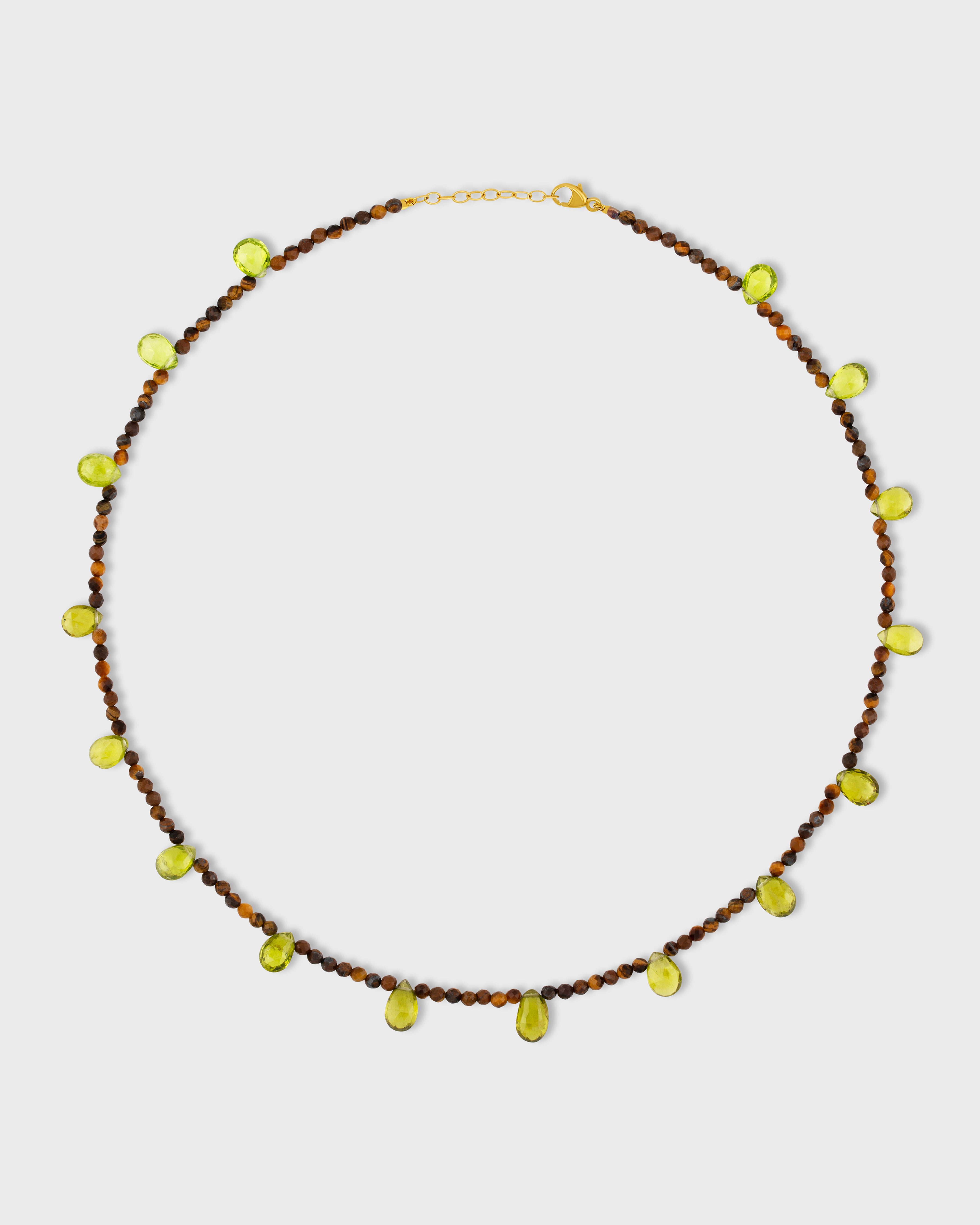 This stunning necklace pairs the warm, golden hues of Tiger’s Eye with the fresh vibrancy of Peridot drops. The combination offers a grounded yet energizing look, perfect for adding a touch of nature's beauty to any outfit.
