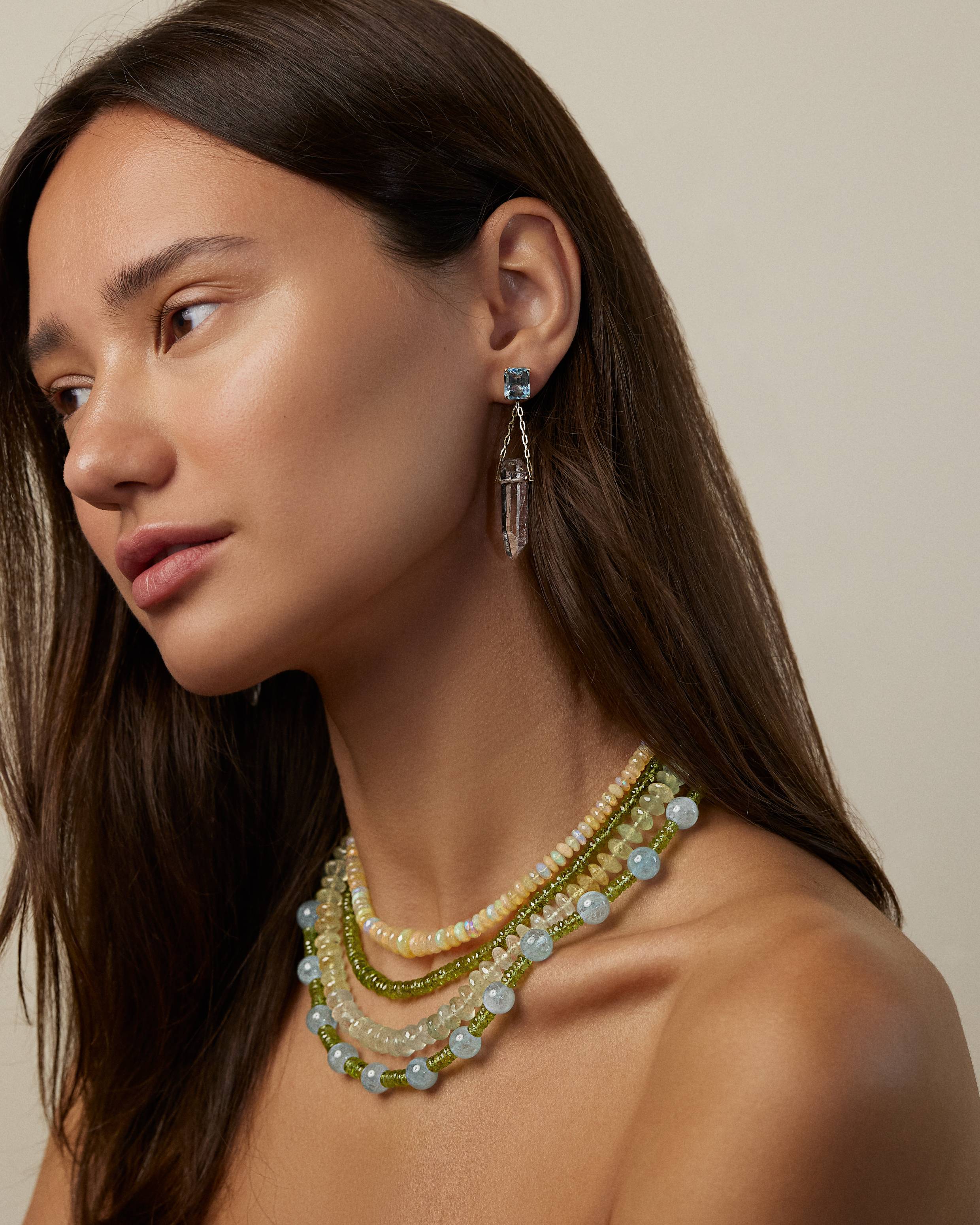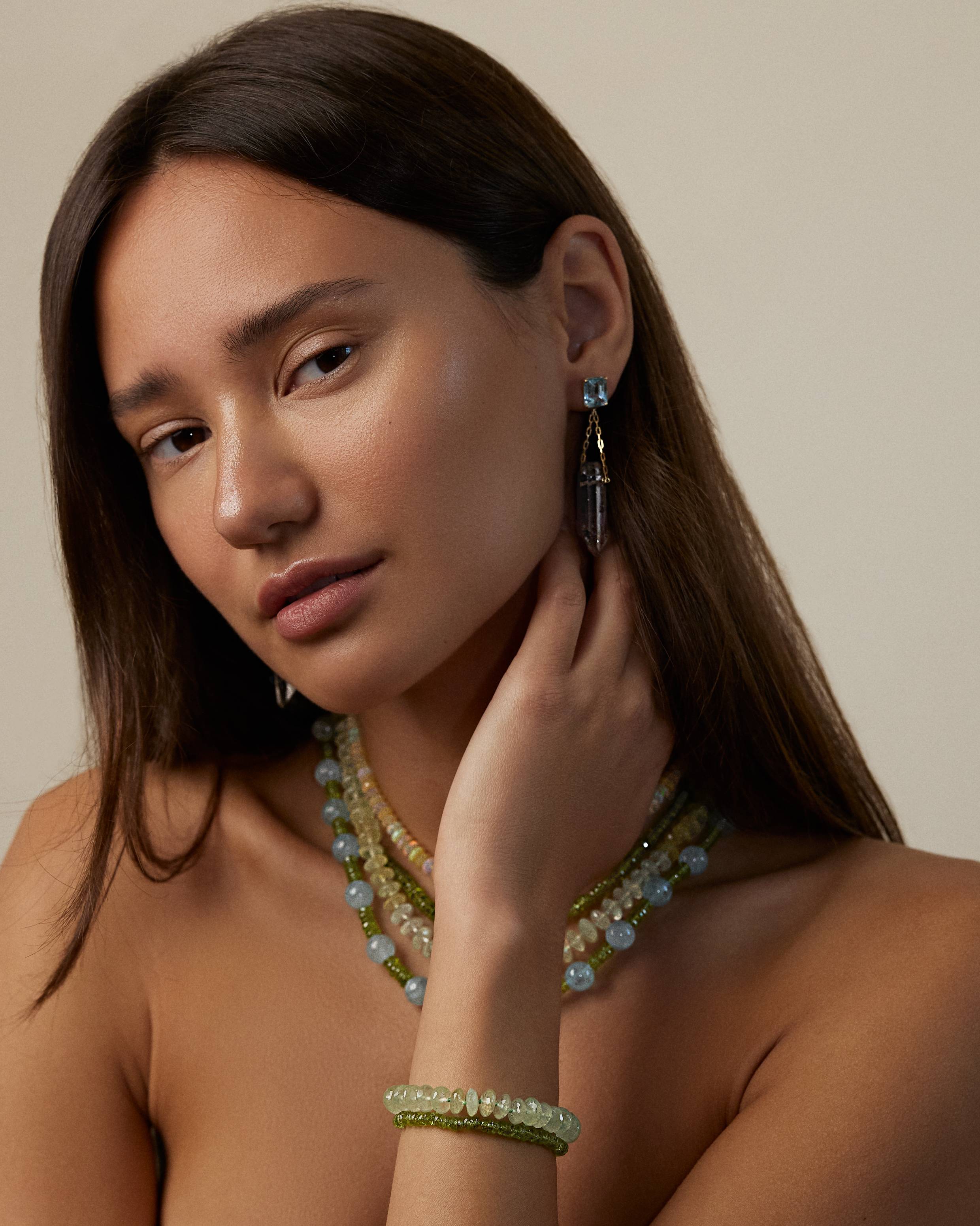 Each beaded jewelry piece is hand strung from the highest quality materials that are cut from natural mineral sources. They are sensitive to prolonged exposure to hairsprays and scents. To ensure longevity please be gentle and avoid tugging and pulling of these pieces.