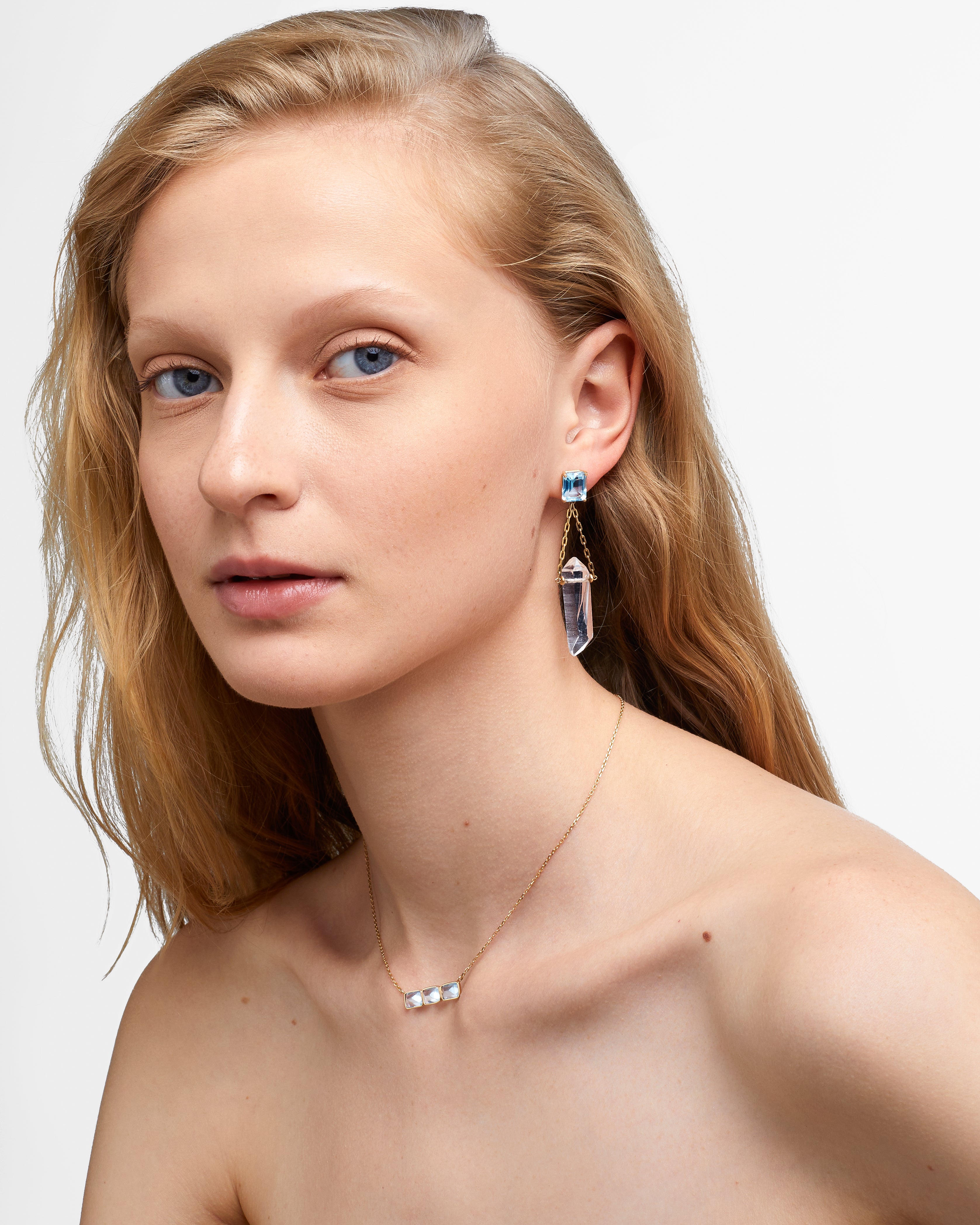 Blue Topaz emerald cut gemstones paired back to raw natural crystal quartz all is custom hand set in 14 karat gold.