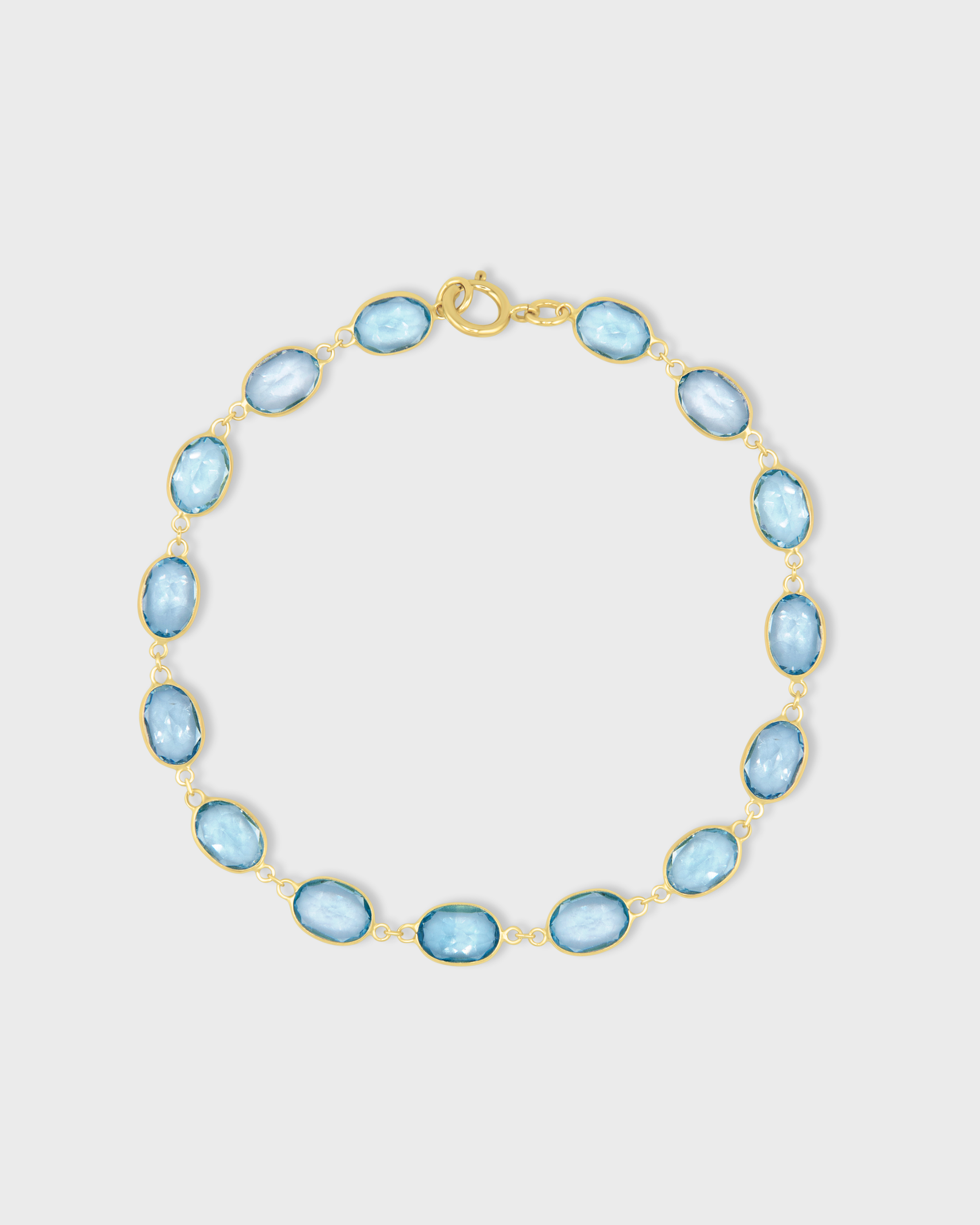 This vibrant bracelet features a delicate chain adorned with a row of sparkling blue topaz. The minimalist design and bright color make it a versatile and eye-catching piece.