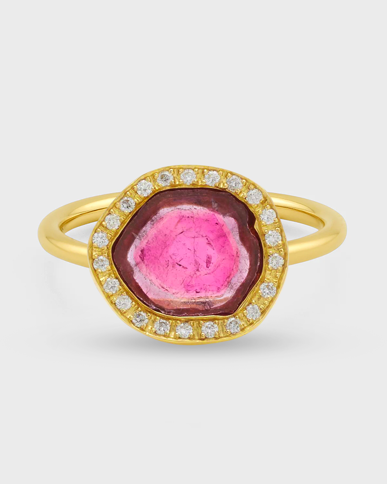 One of a kind gemmy pink tourmaline slice that is surrounded by a diamond halo made by hand in 18 karat gold. A nurturing shade of Tourmaline, the pink variety is all about supports compassion and gentleness and dealing with matters of the heart.
