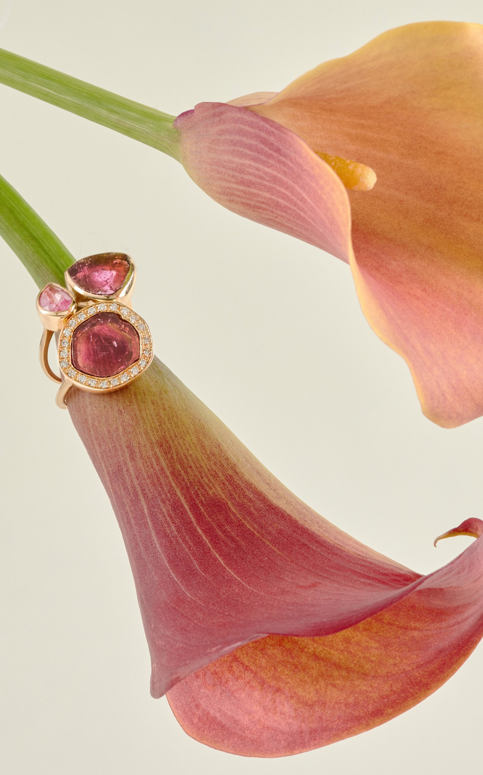 One of a kind gemmy pink tourmaline slice paired back to a pear shape pink tourmaline gemstone that is custom hand set in 18 karat gold. A nurturing shade of Tourmaline, the pink variety is all about supports compassion and gentleness and dealing with matters of the heart.