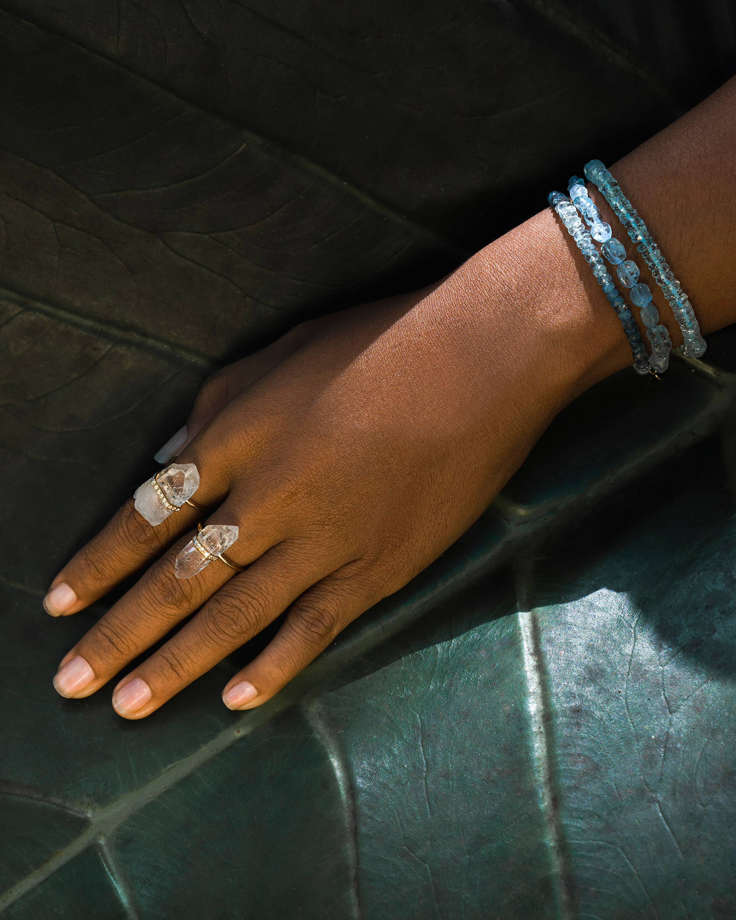Aquamarine evokes the purity of crystalline waters and the exhilaration and relaxation of the sea. This tranquil blue stone is calming, soothing, and cleansing, and inspires truth, trust and letting go. In ancient times, Aquamarine crystals were believed to be the treasure of mermaids, and was used by sailors as a talisman of good luck, fearlessness and protection. It was also considered a stone of eternal youth and happiness. Today it protects all who travel by, over, or near water, and opens the channels of clear and heartfelt communication. Under the light of the moon, Aquamarine is empowered to be a prophetic tool.