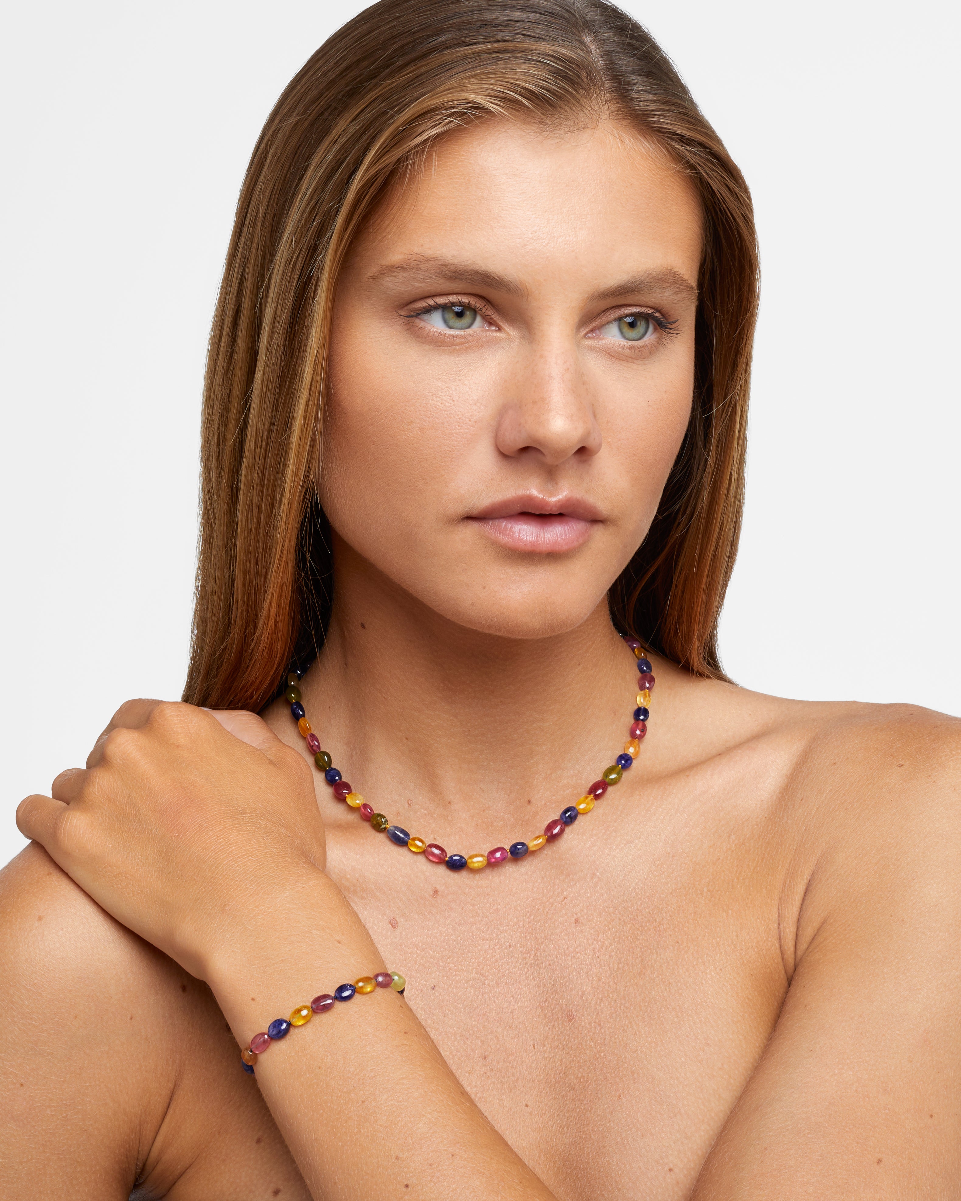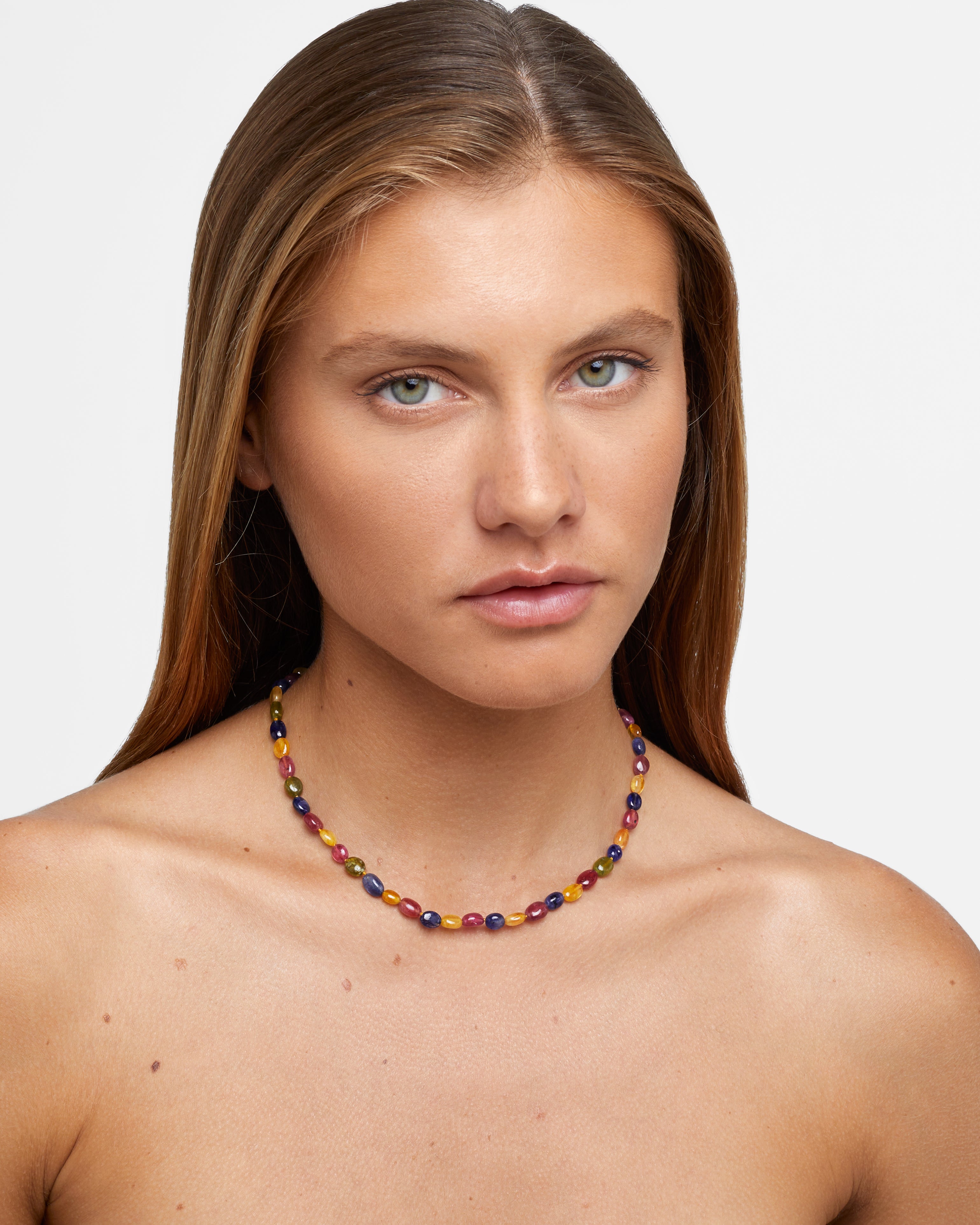 This vibrant necklace features an array of multicolor sapphires, perfectly strung to create a playful yet elegant piece. The rich combination of colors, including blues, pinks, and greens, adds a unique and dynamic touch to any outfit.