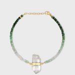 Emerald hand beaded bracelet with a clear crystal quartz charm custom handset in 14 karat gold in our New York City workshop. Each crystal is one-of-a-kind with natural clarity and shapes that attune to vibrational needs of the beholder.