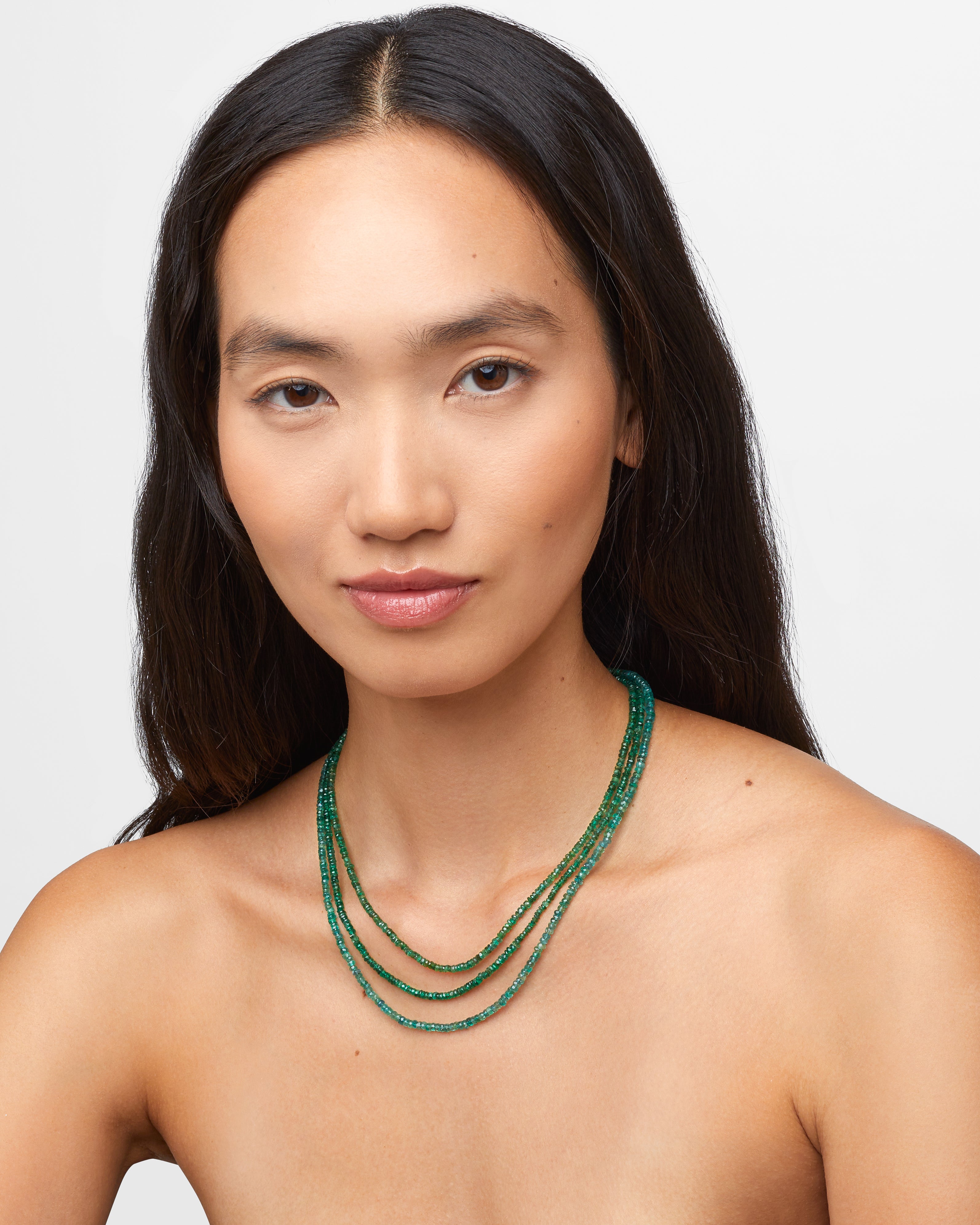 Three layers of emerald hand strung in the heart of New York City and finished with lustrous 14 karat yellow gold.