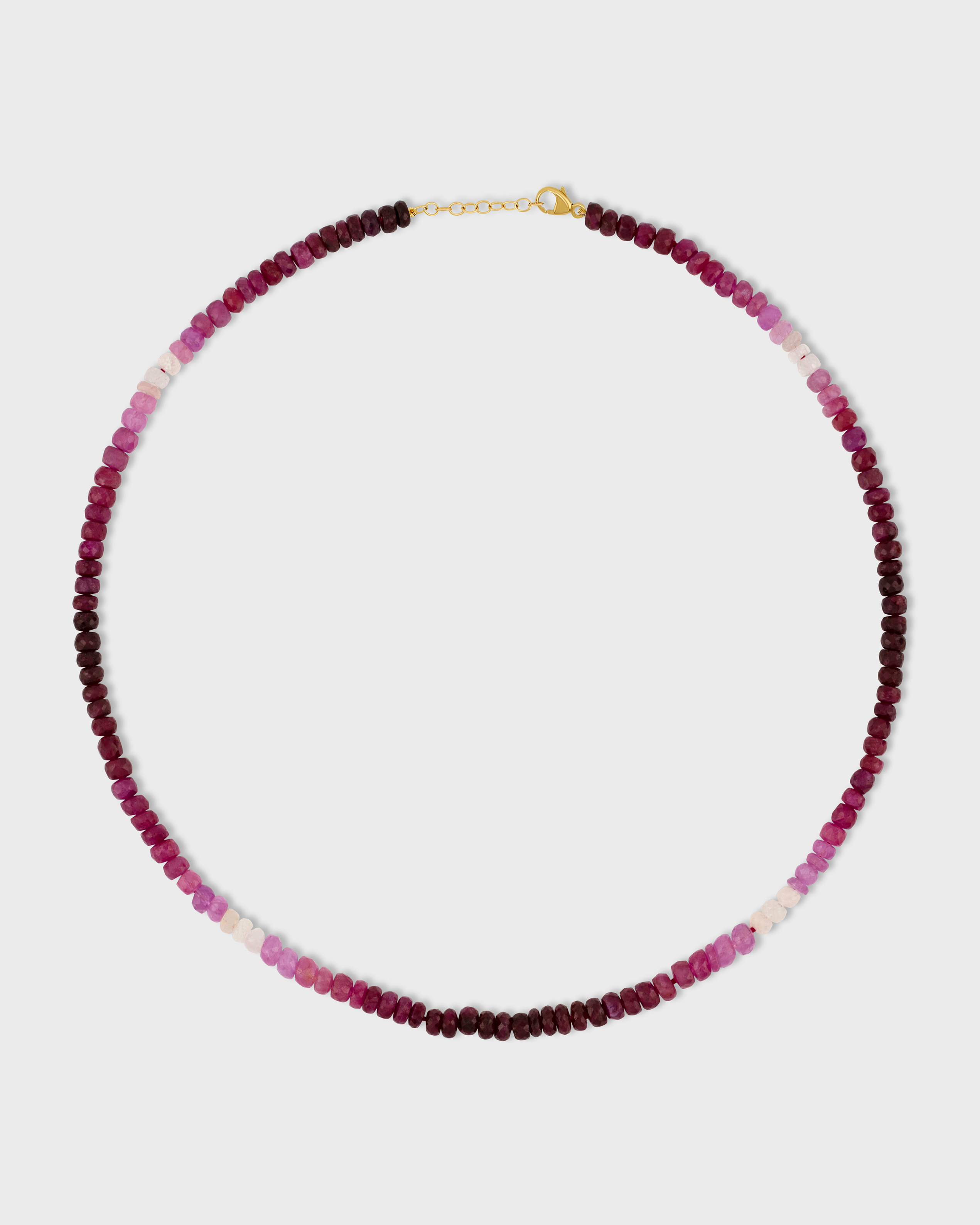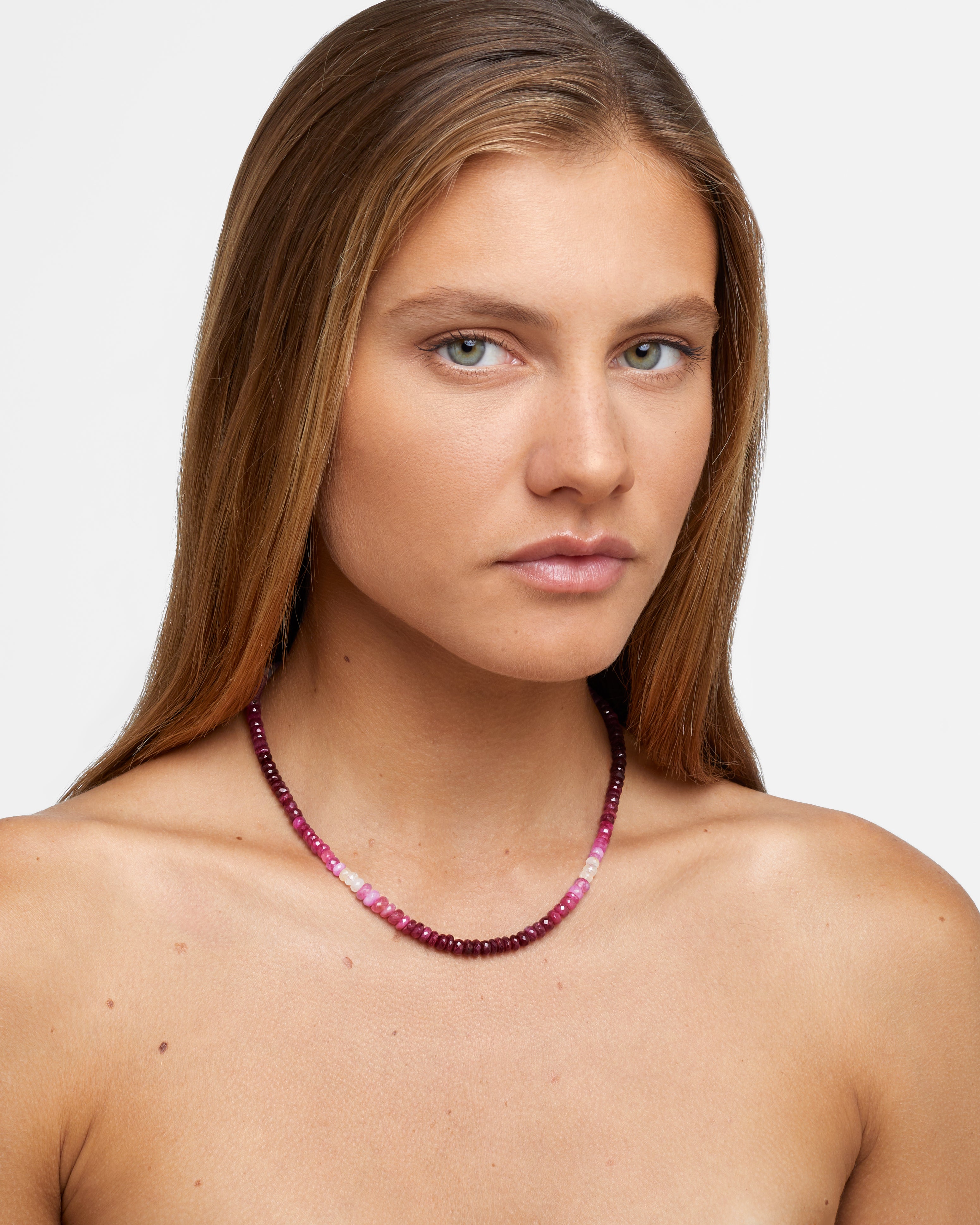 Hand strung jumbo ruby ombre necklace with 5mm diameter ruby beads and finished in 14 karat gold in NYC.