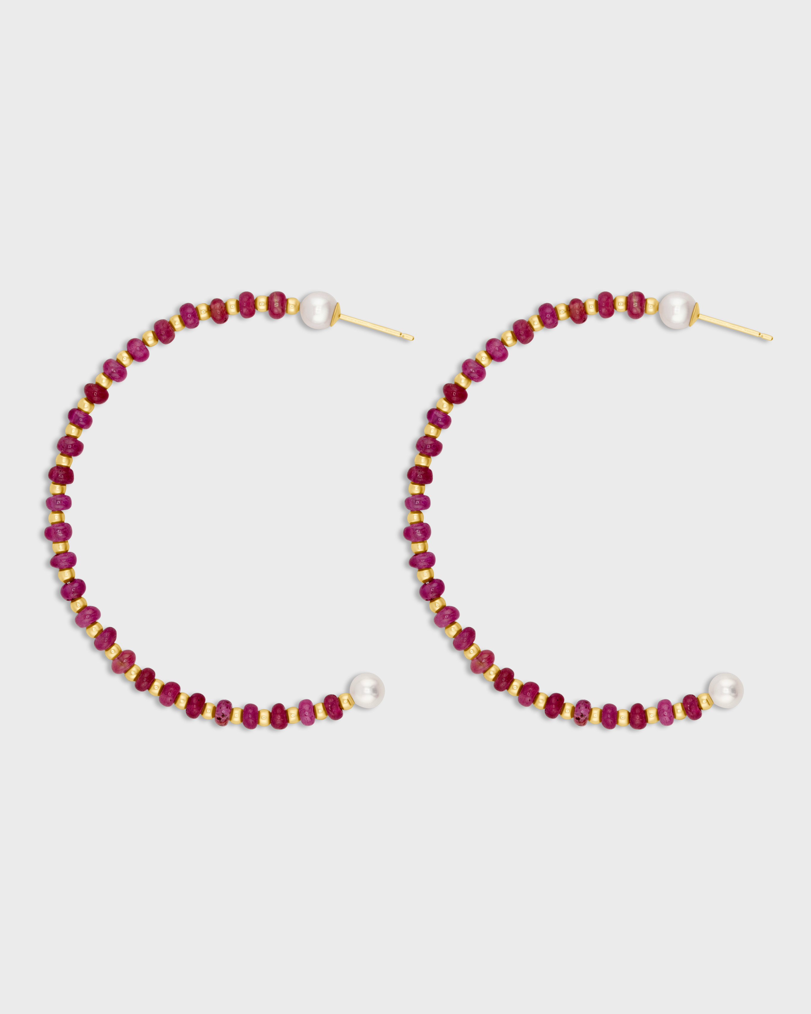 Arizona Large Ruby Pearl Gold Bead Hoop Earrings