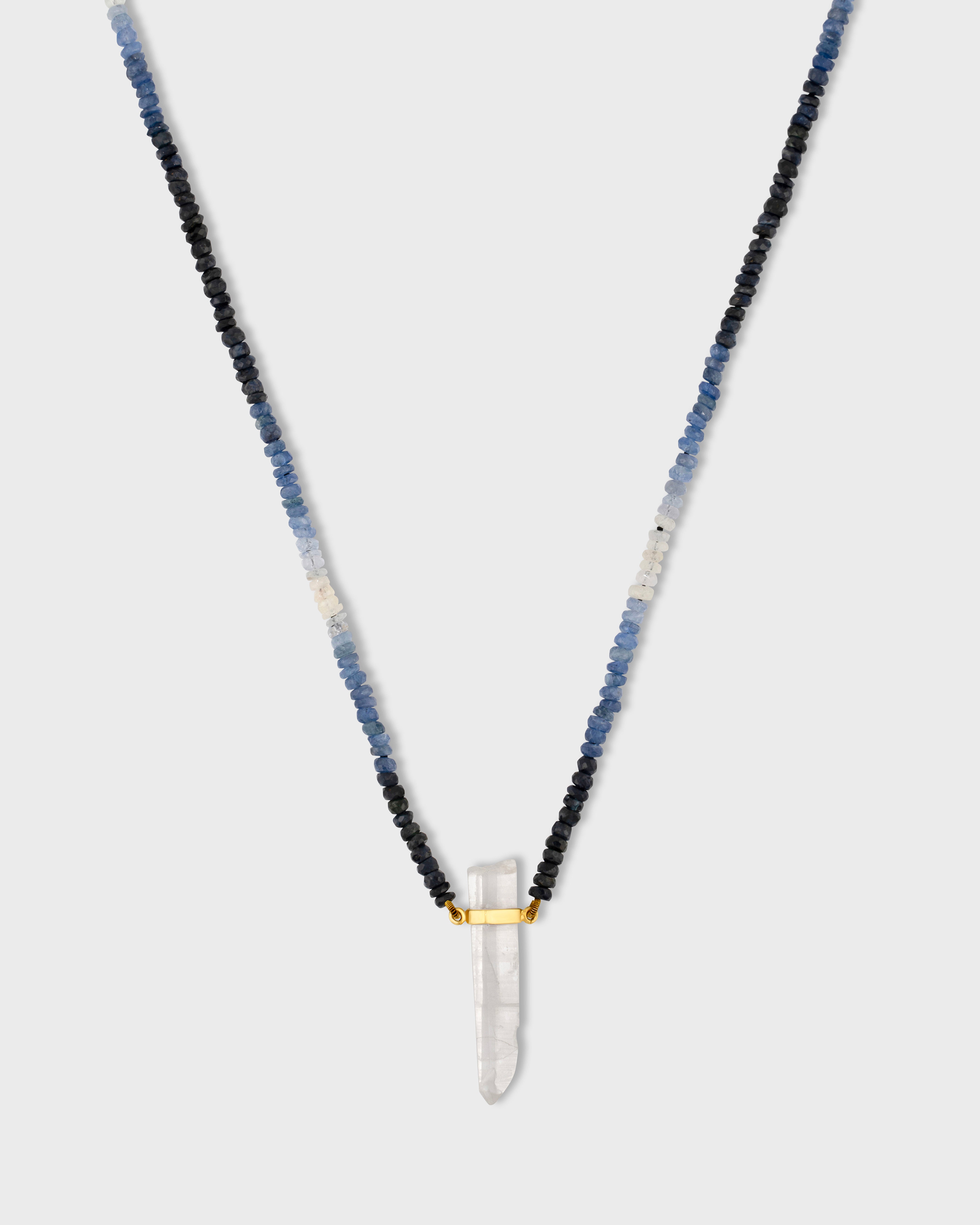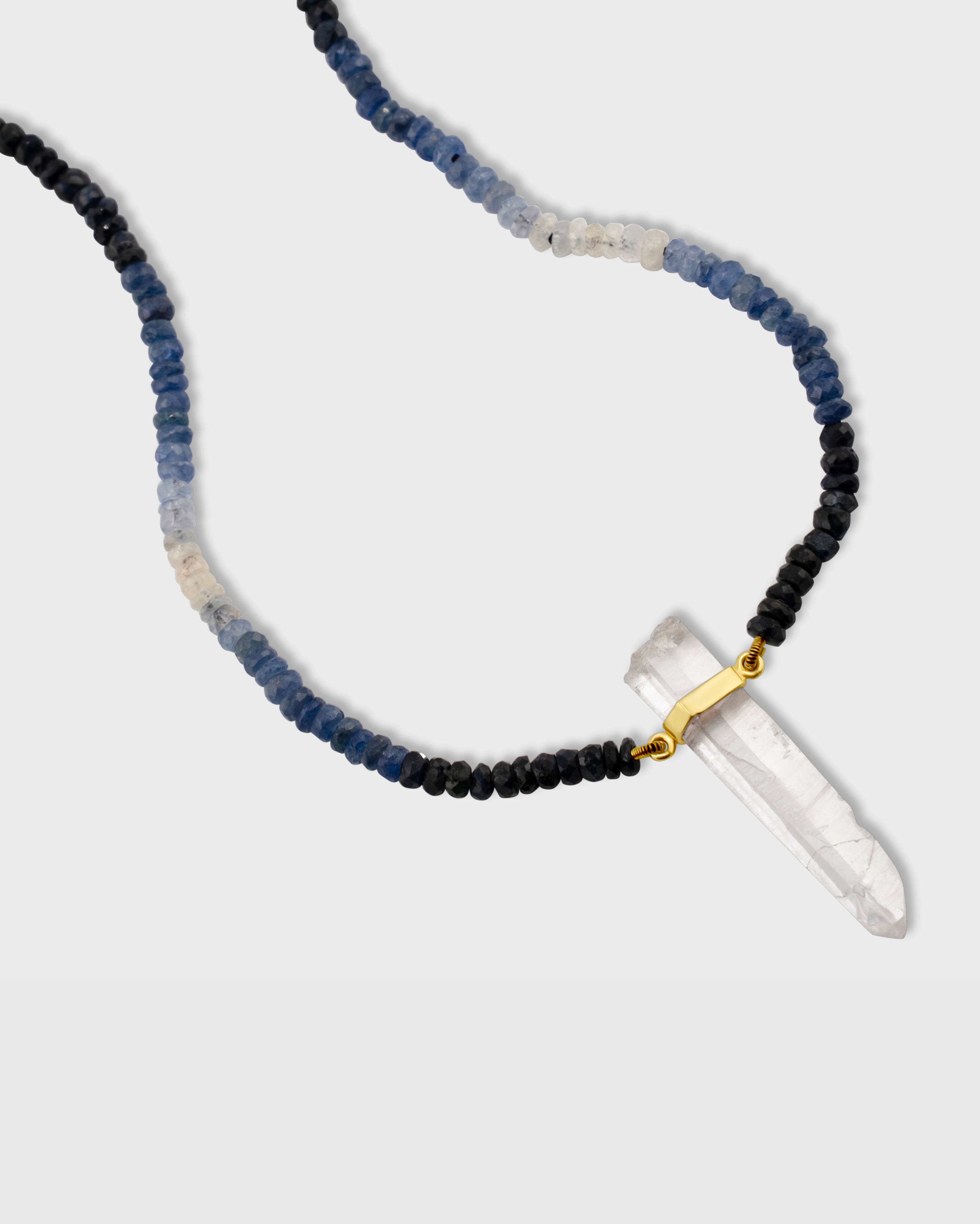 With ombre blue sapphires fading into crystal quartz, this necklace captures the beauty of the desert sky. The gold bar serves as a stunning centerpiece, making this a sophisticated and vibrant addition to any collection.