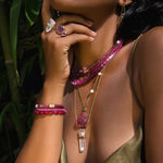 Rubies symbolize power, passion, and protection. When worn as a talisman, ruby was believed to help protect warriors in battle. It deeply resonates with the base chakra, which can result in an increase of strength, stamina, sense of security and personal power.
