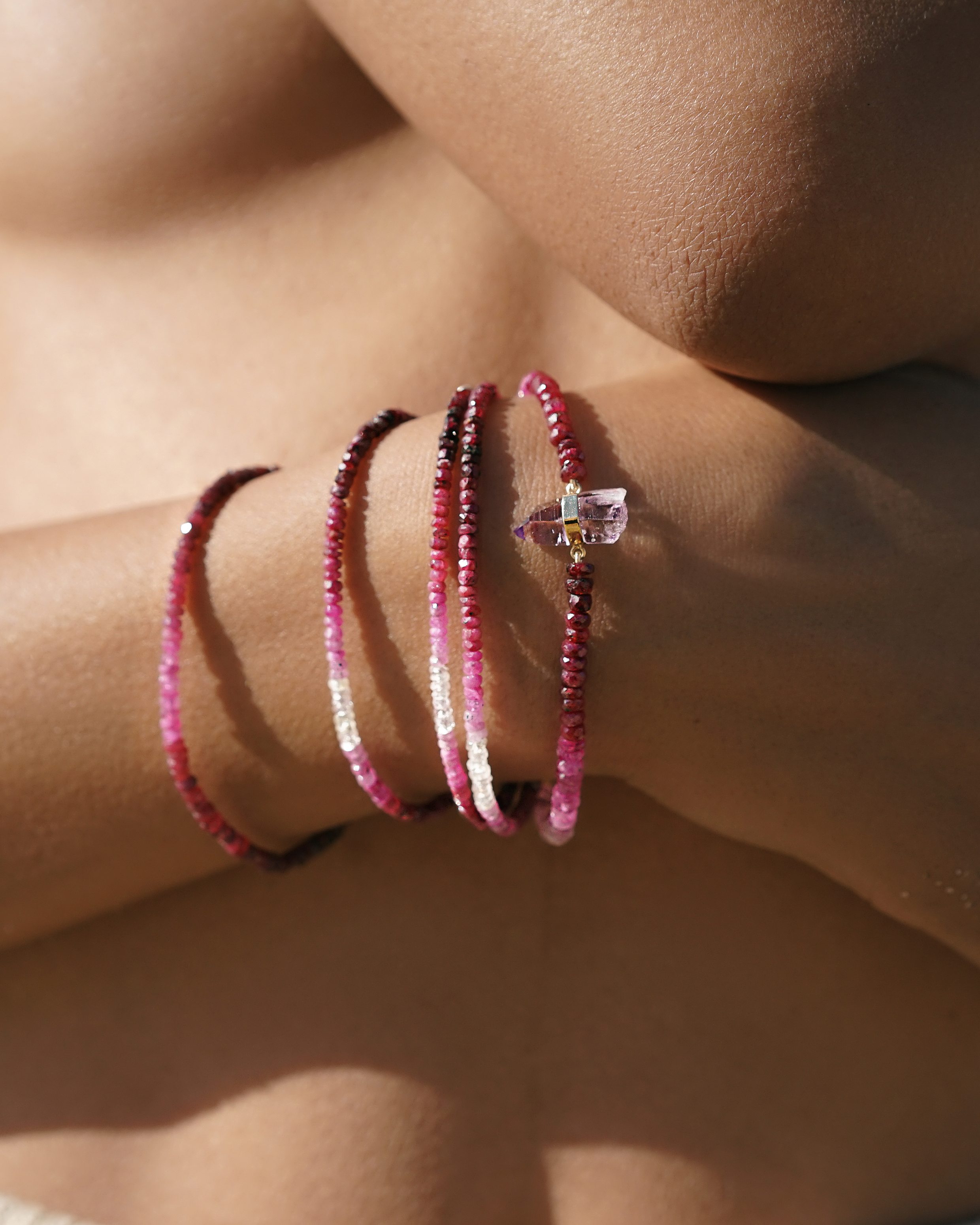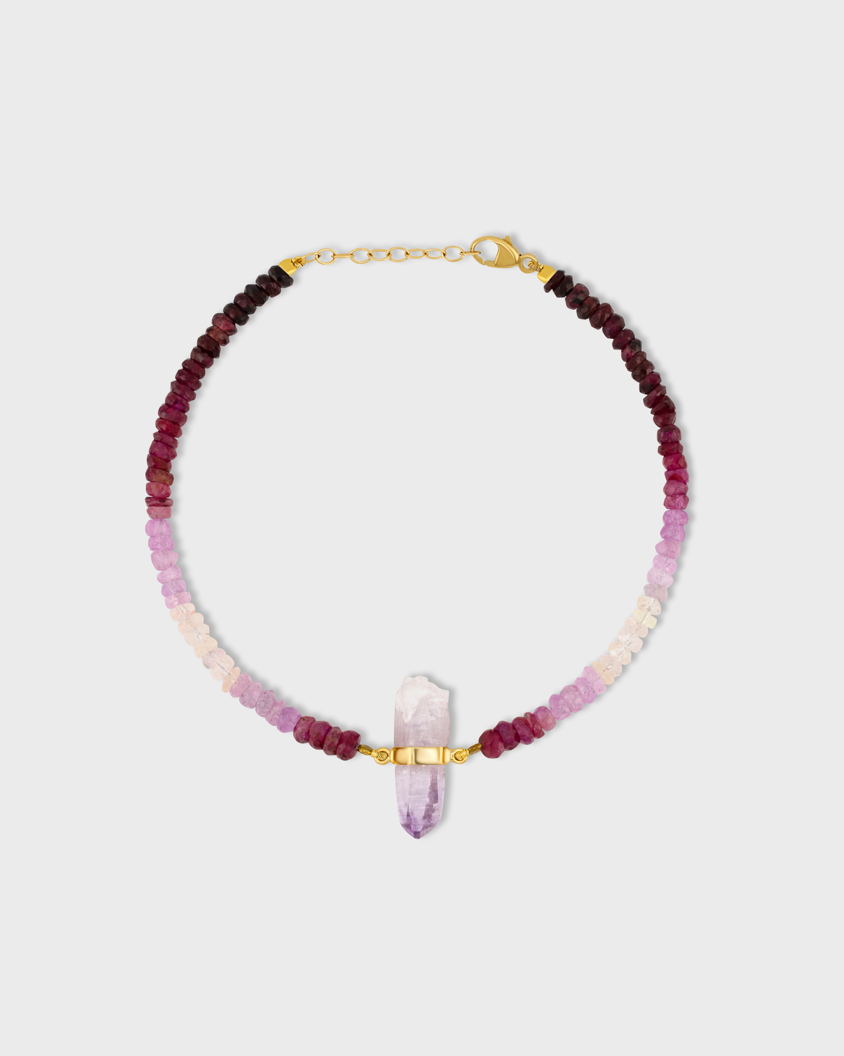 Ruby bracelet with a Veracruz Amethyst Crystal charm custom handset in 14 karat gold in our New York City workshop. Each crystal is one-of-a-kind with natural clarity and shapes that attune to vibrational needs of the beholder.