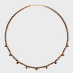 The Arizona Smoky Quartz Gem Drop Necklace features delicate opal beads interspersed with stunning smoky quartz gem drops, creating a beautiful and earthy design. The natural tones and elegant drop details are complemented by a gold clasp, making this necklace both timeless and sophisticated.