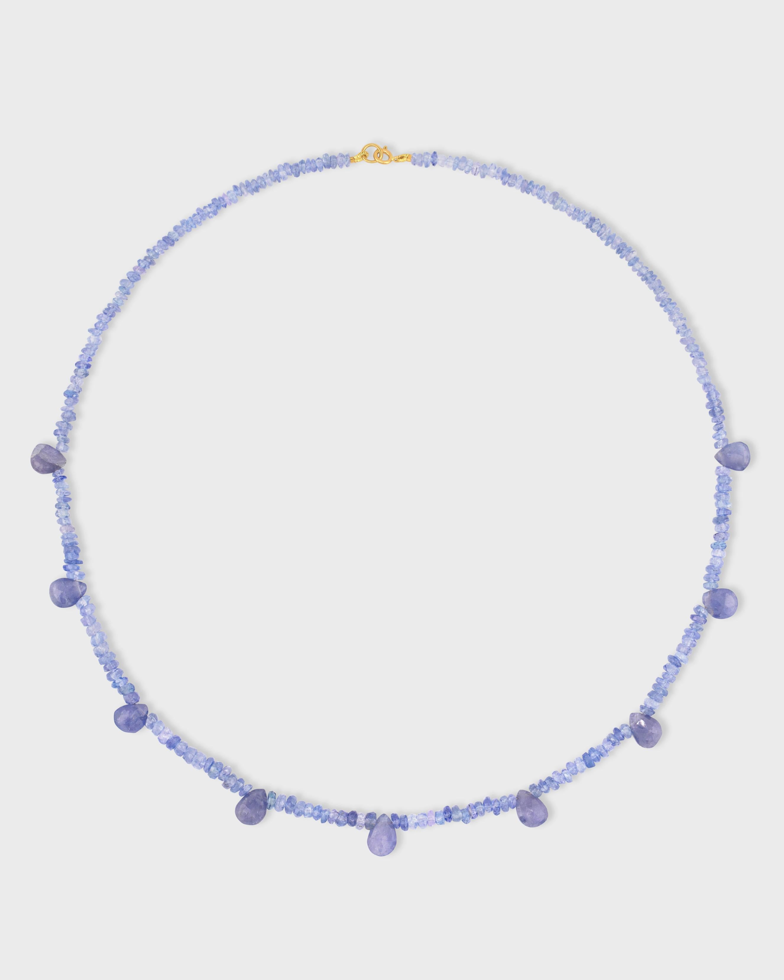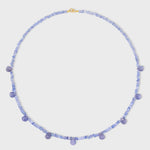 The Tanzanite Gem Drop Necklace features delicate tanzanite beads, interspersed with smooth tanzanite gem drops. This ethereal design captures the subtle glow of tanzanite, creating a serene and sophisticated piece that enhances any outfit with its soft, luminous charm.