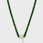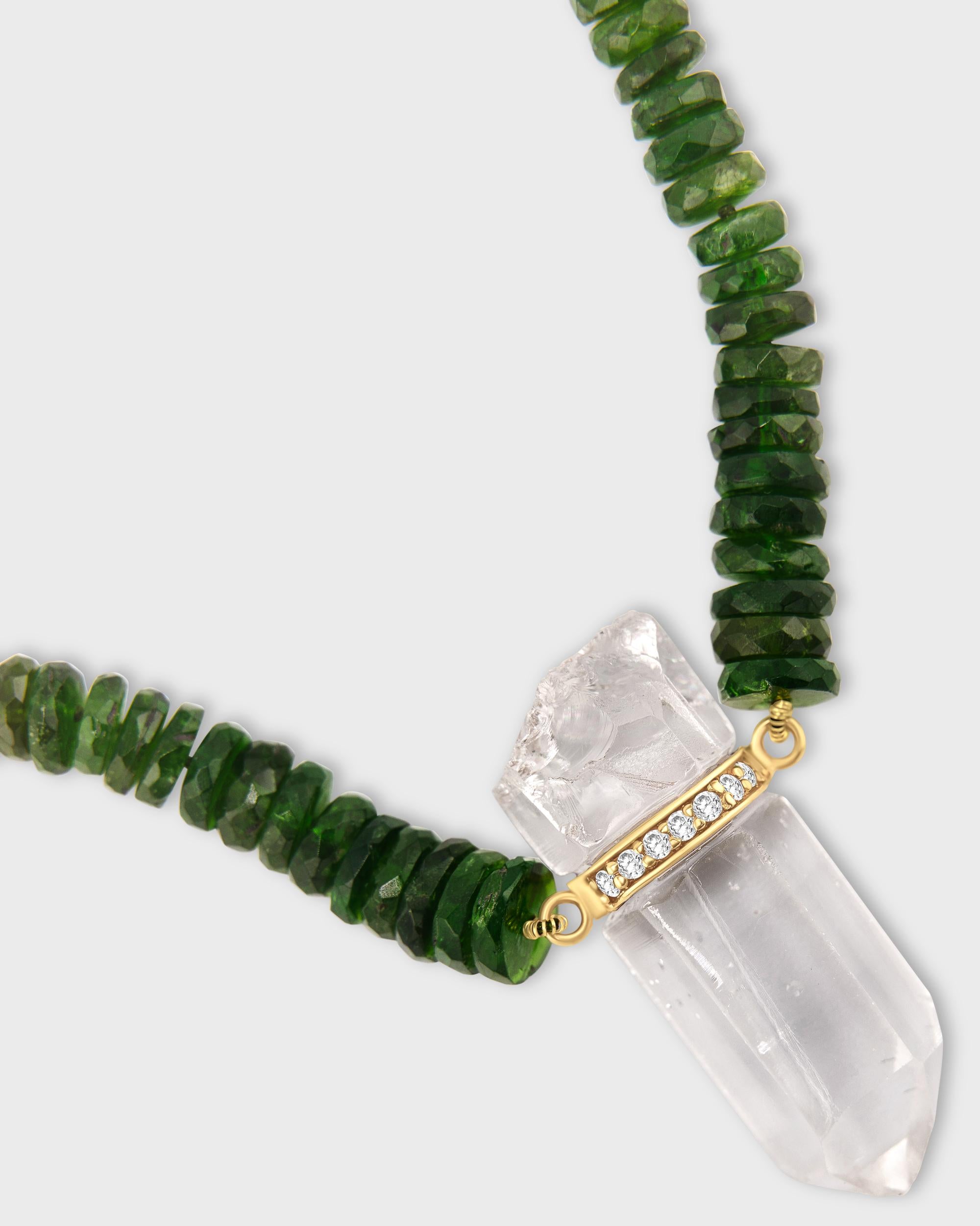Vibrant green chrome diopside beads meet a luminous crystal quartz point wrapped in a diamond bar, creating a necklace of grounding and clarity. A bold, one-of-a-kind treasure.