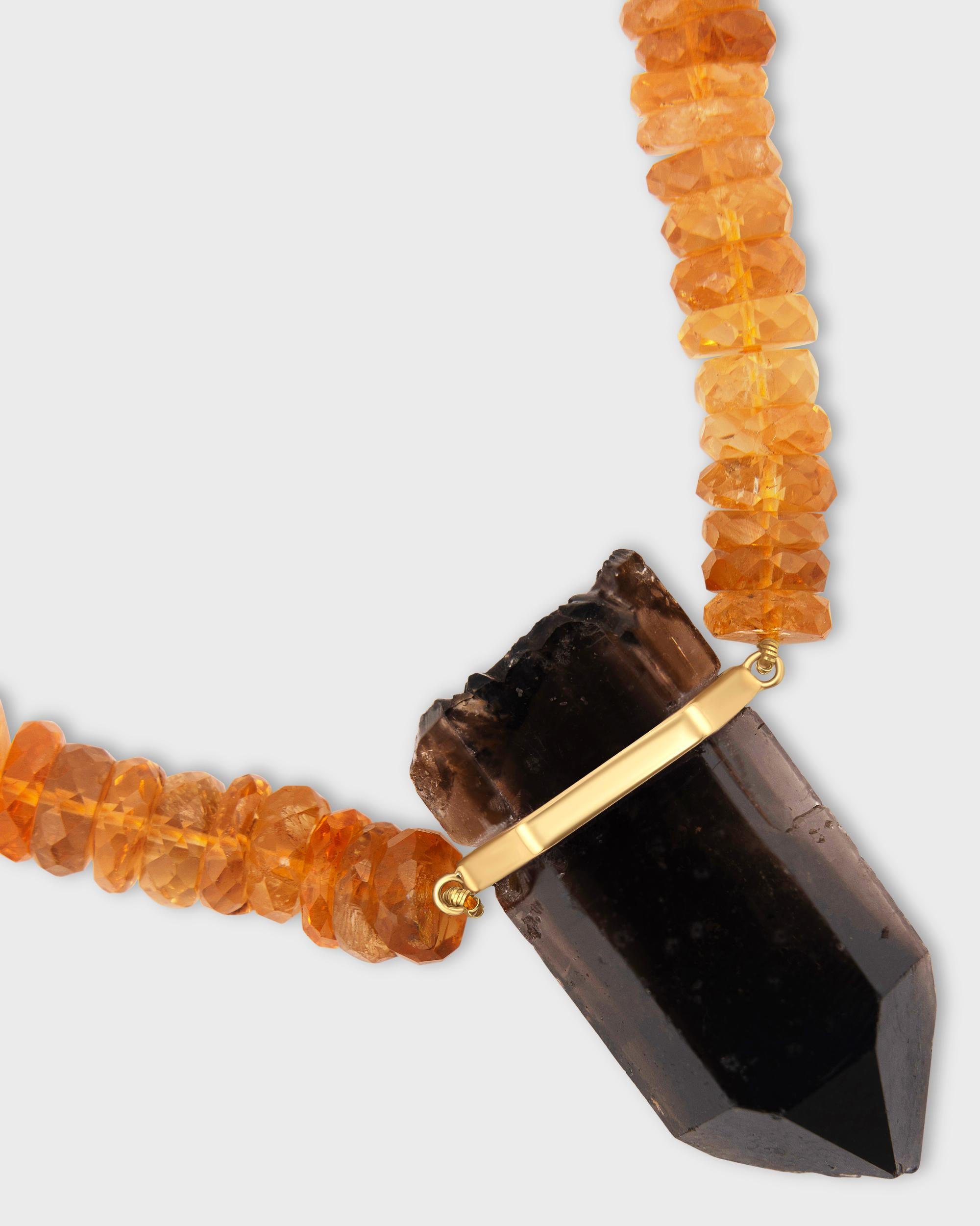 Golden citrine beads accented with a smoky quartz crystal wrapped in a gold bar embody warmth and grounding. A necklace that glows with balance and strength.