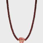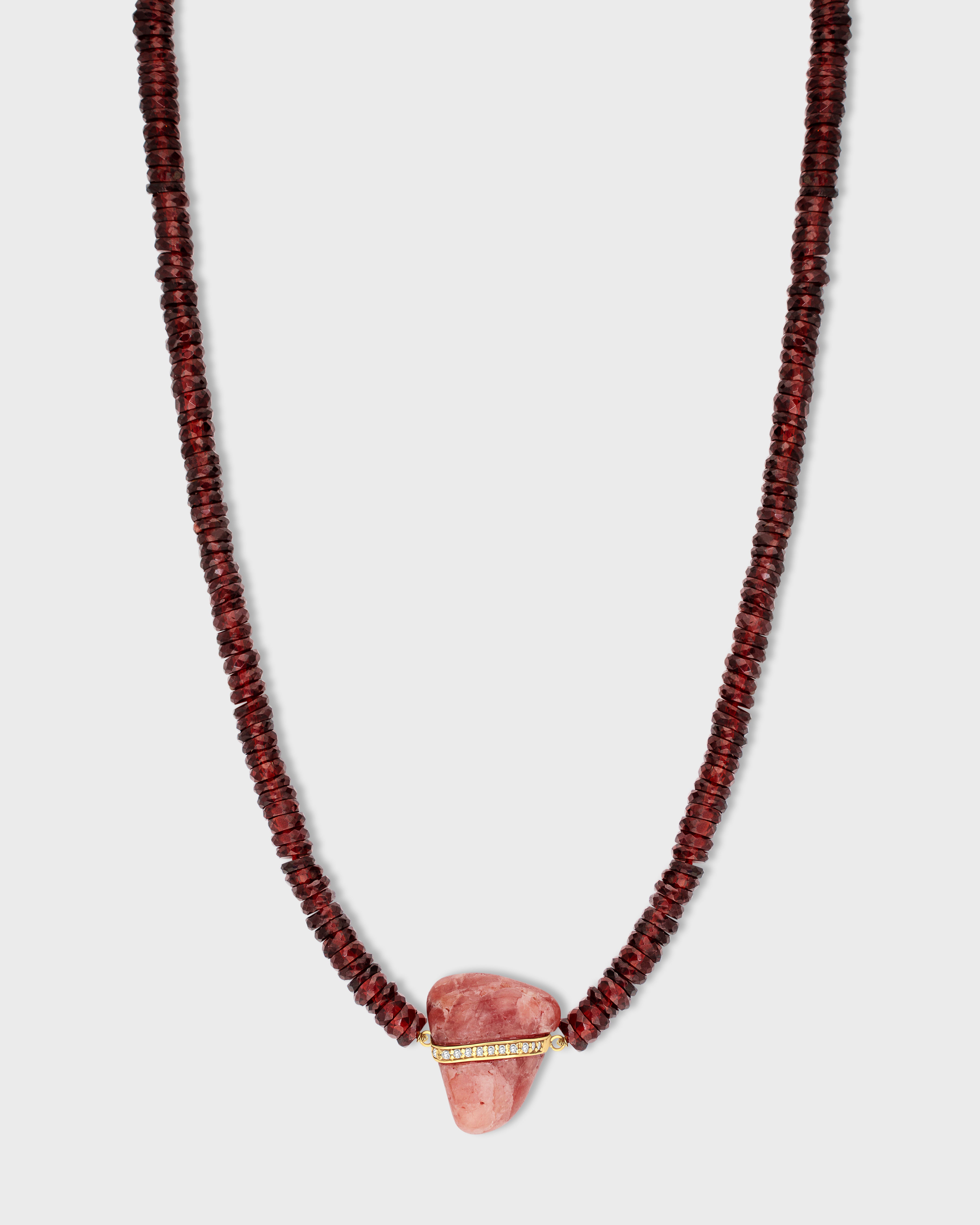 Faceted garnet beads are accented with a striking rhodochrosite center wrapped in a diamond bar, blending passion and love in one radiant necklace. A statement piece full of depth and energy.