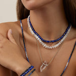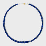 A rich blue of Lapis Lazuli hand cut into faceted crystals hand strung with silk in New York City. What makes this piece special is its faceted cut nature which gives it a natural sparkle. This necklace is finished in 14 karat gold hardware and chain.
