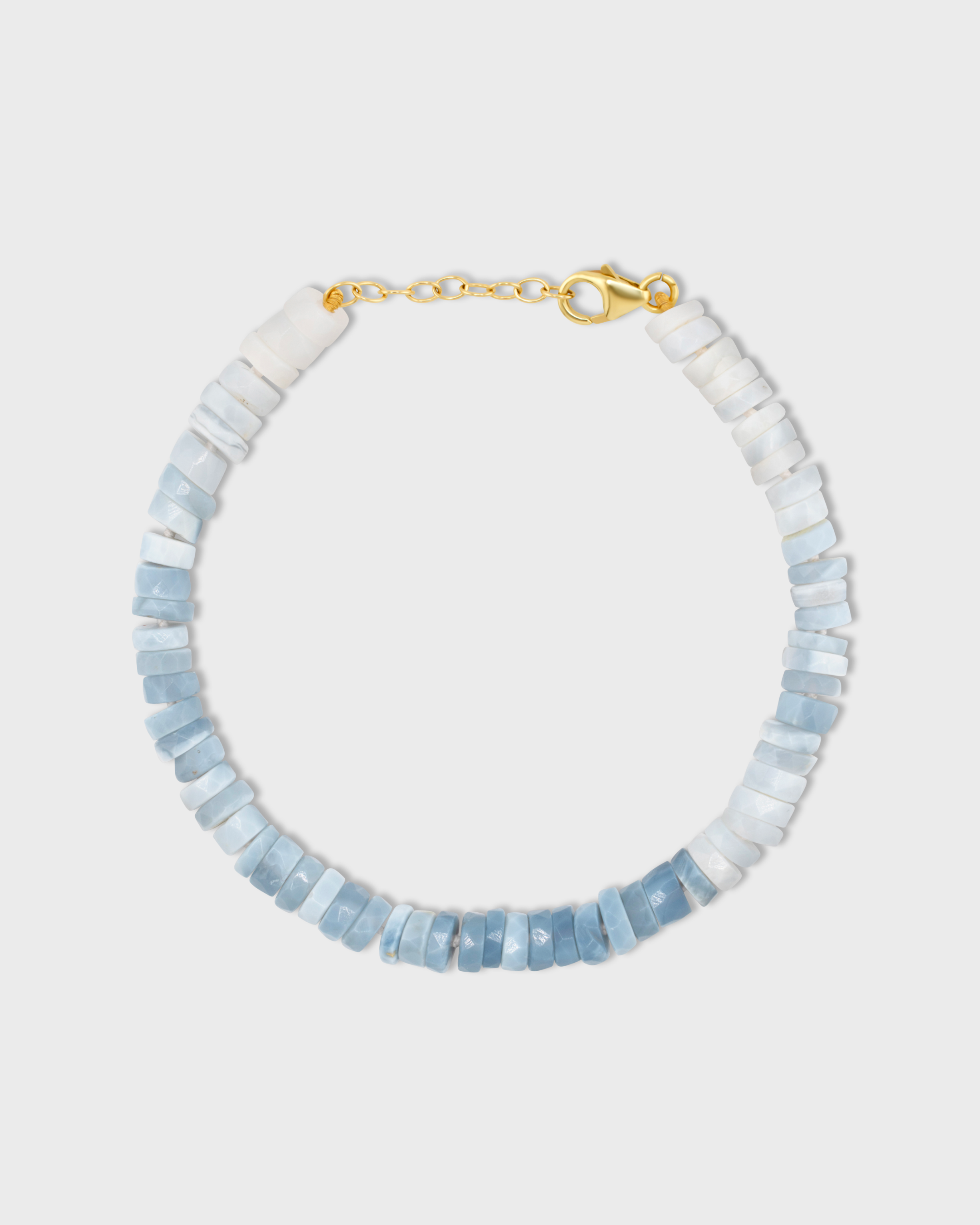 A vibrant blue opal hand cut into faceted crystals hand strung with silk in New York City. This bracelet is finished in 14 karat gold.