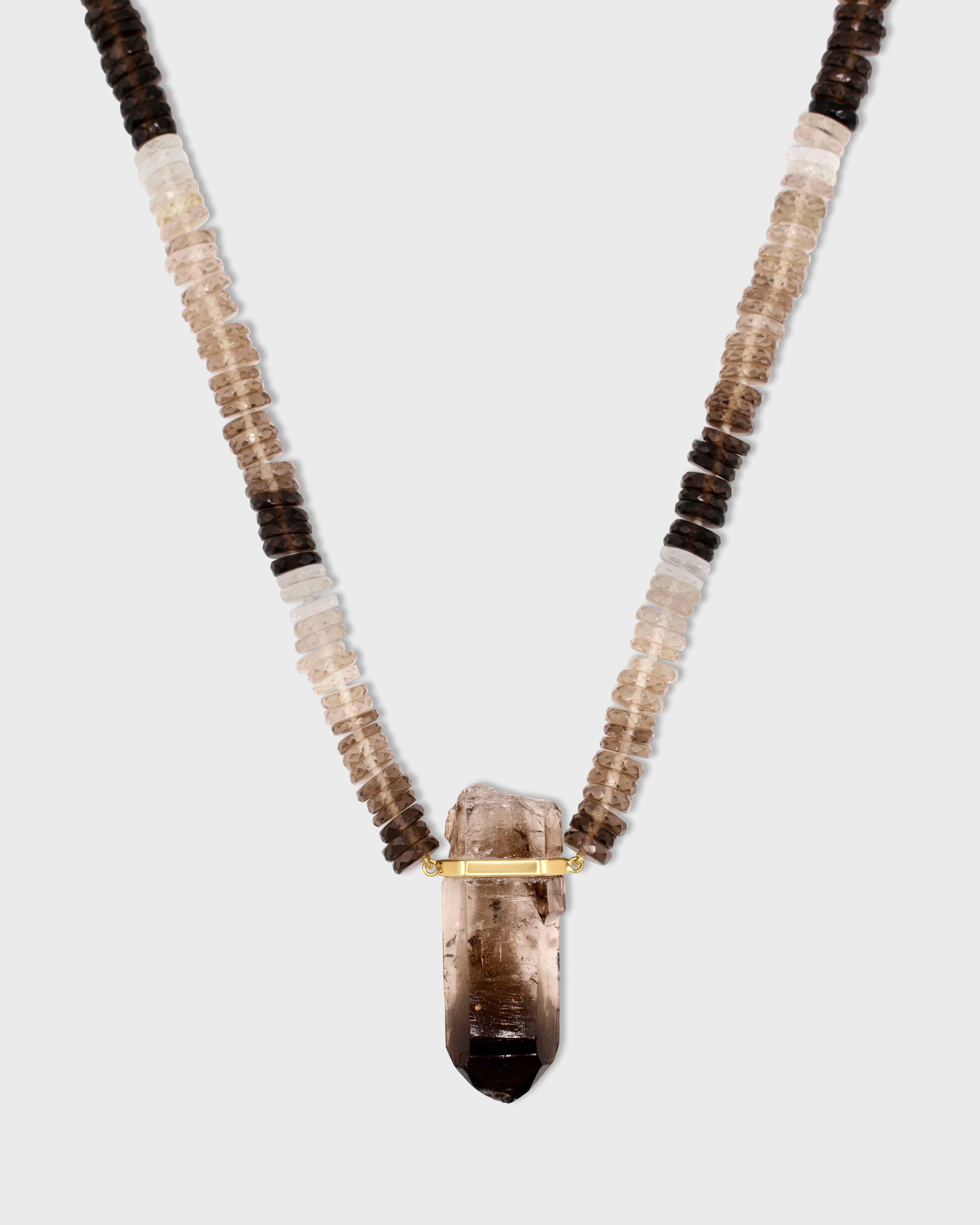 The Master of all grounding stones, the Smoky Quartz is custom hand set by our master craftsmen to its natural one-of-a-kind shape. The crystal is then beautifully hand cut in the faceted style and hand strung with silk in New York City. What makes this piece special is its faceted cut nature which gives it a natural sparkle. This bracelet is finished in 14 karat gold hardware and chain.