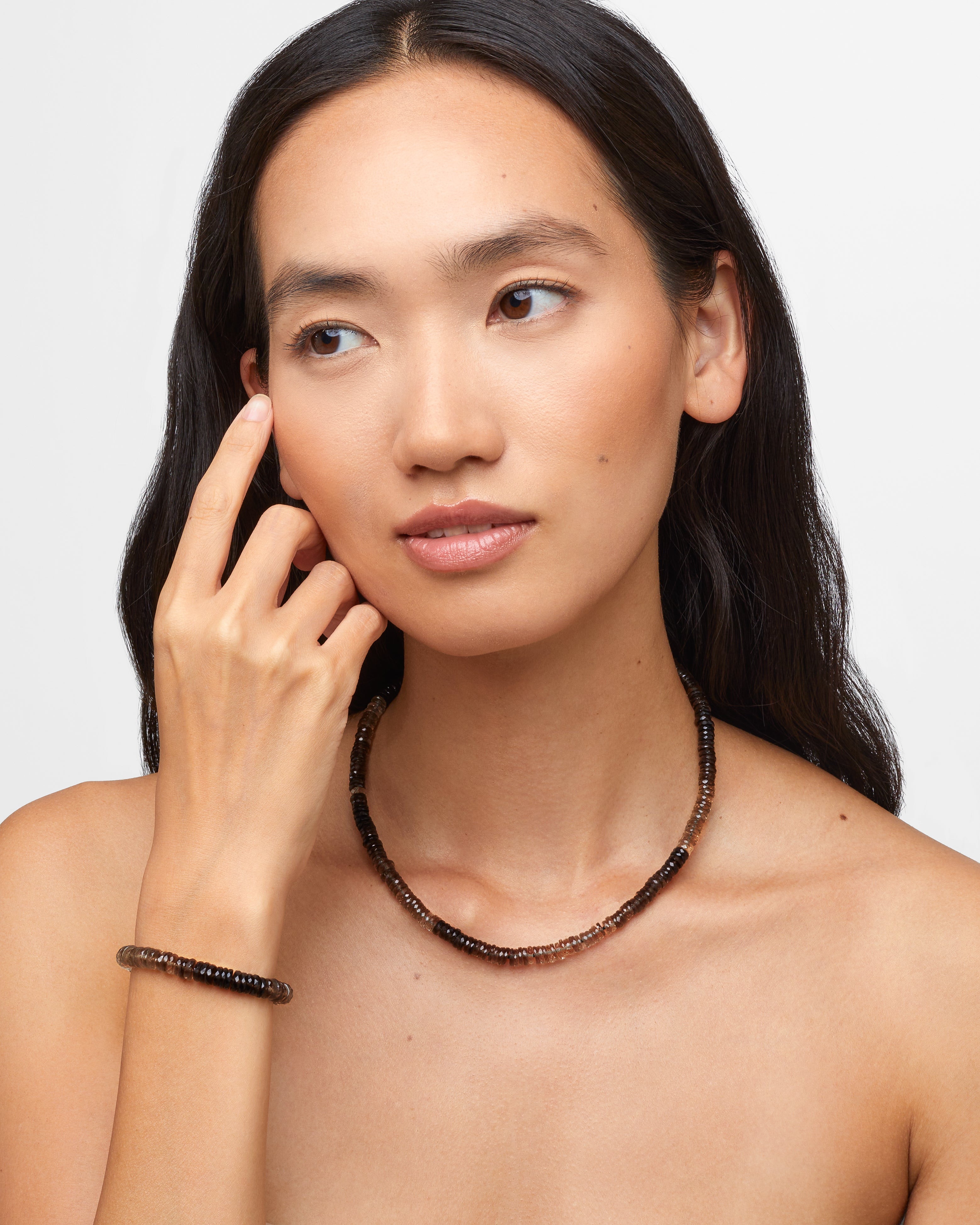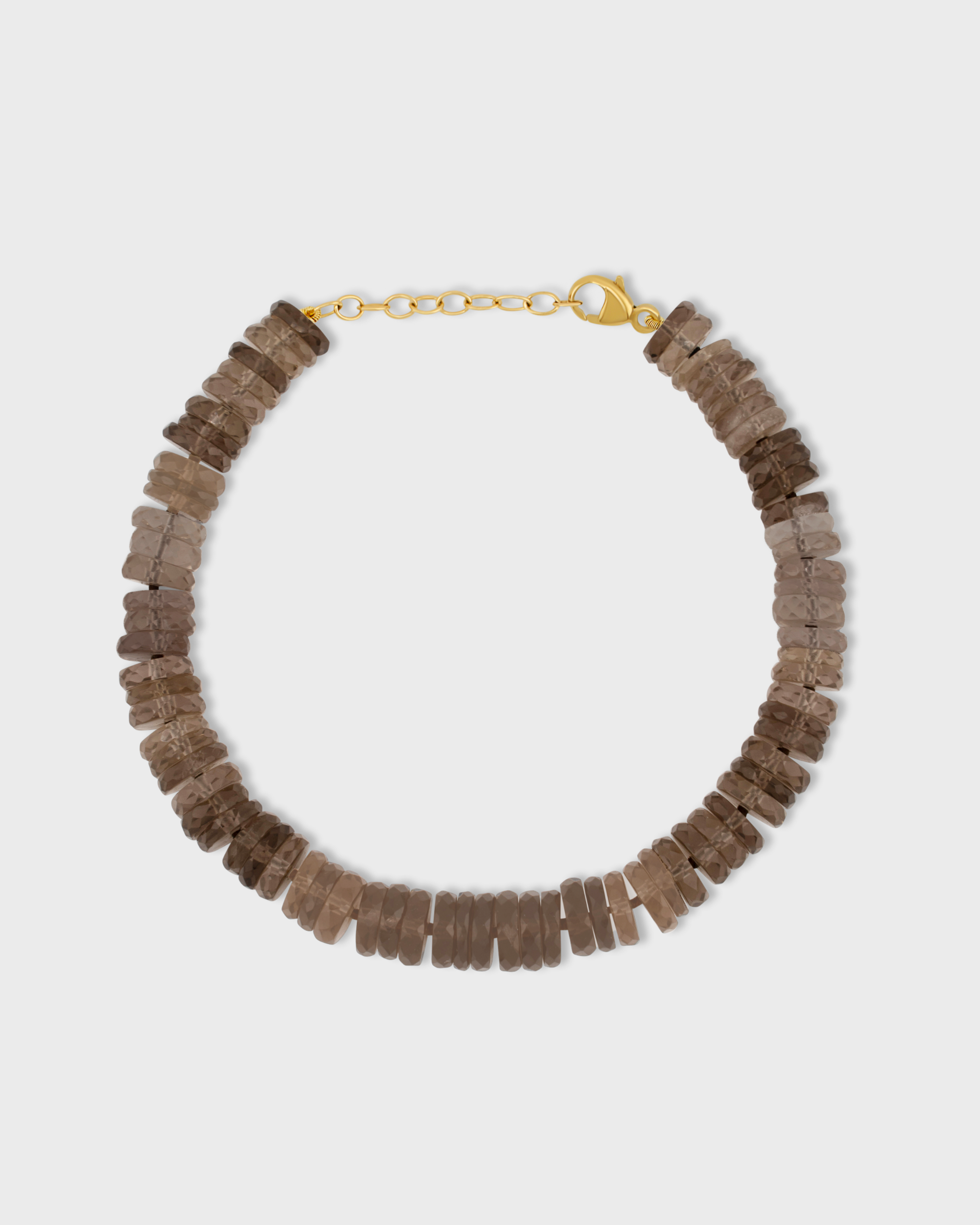 A vibrant smoky quartz hand cut into faceted crystals hand strung with silk in New York City. This bracelet is finished in 14 karat gold.