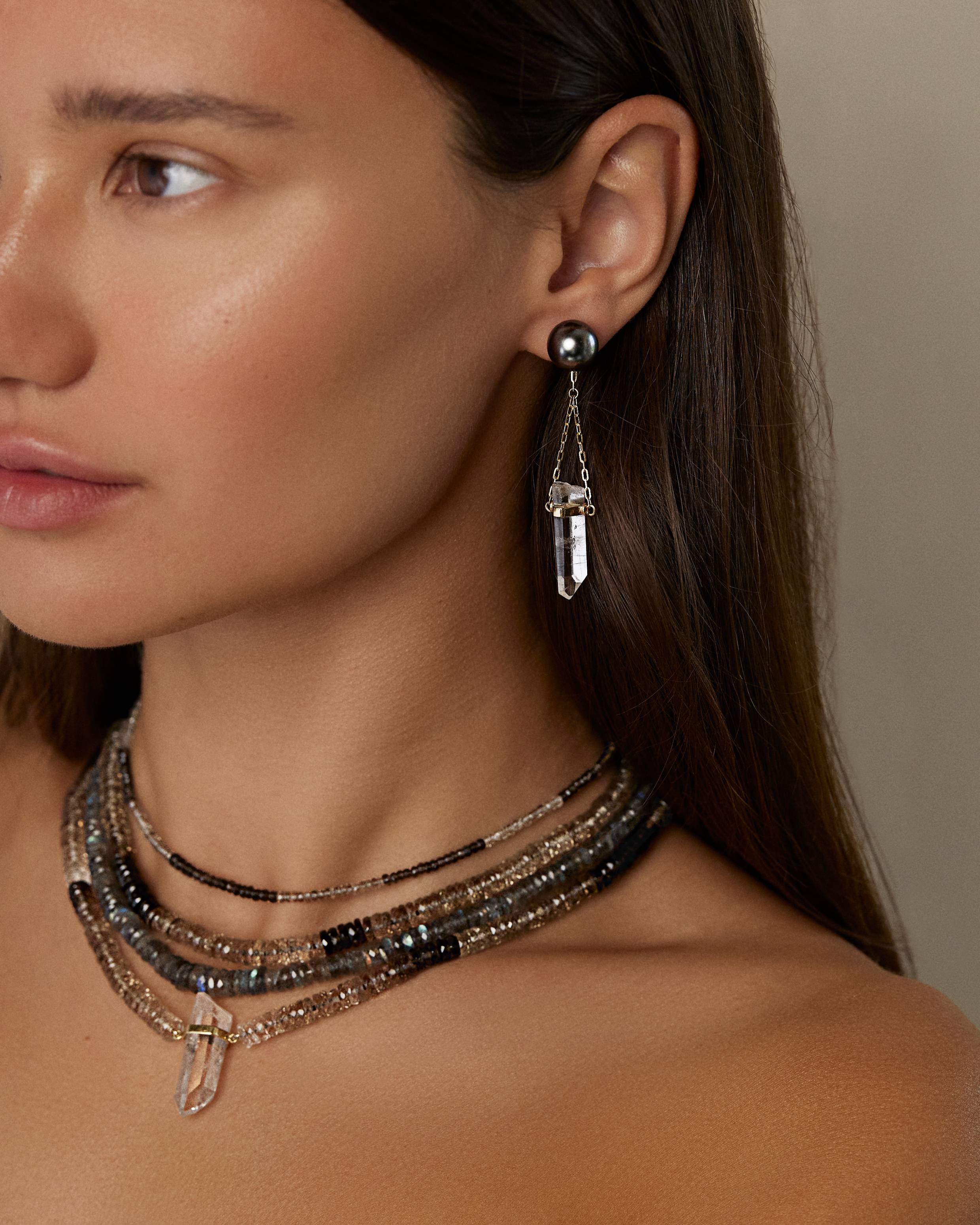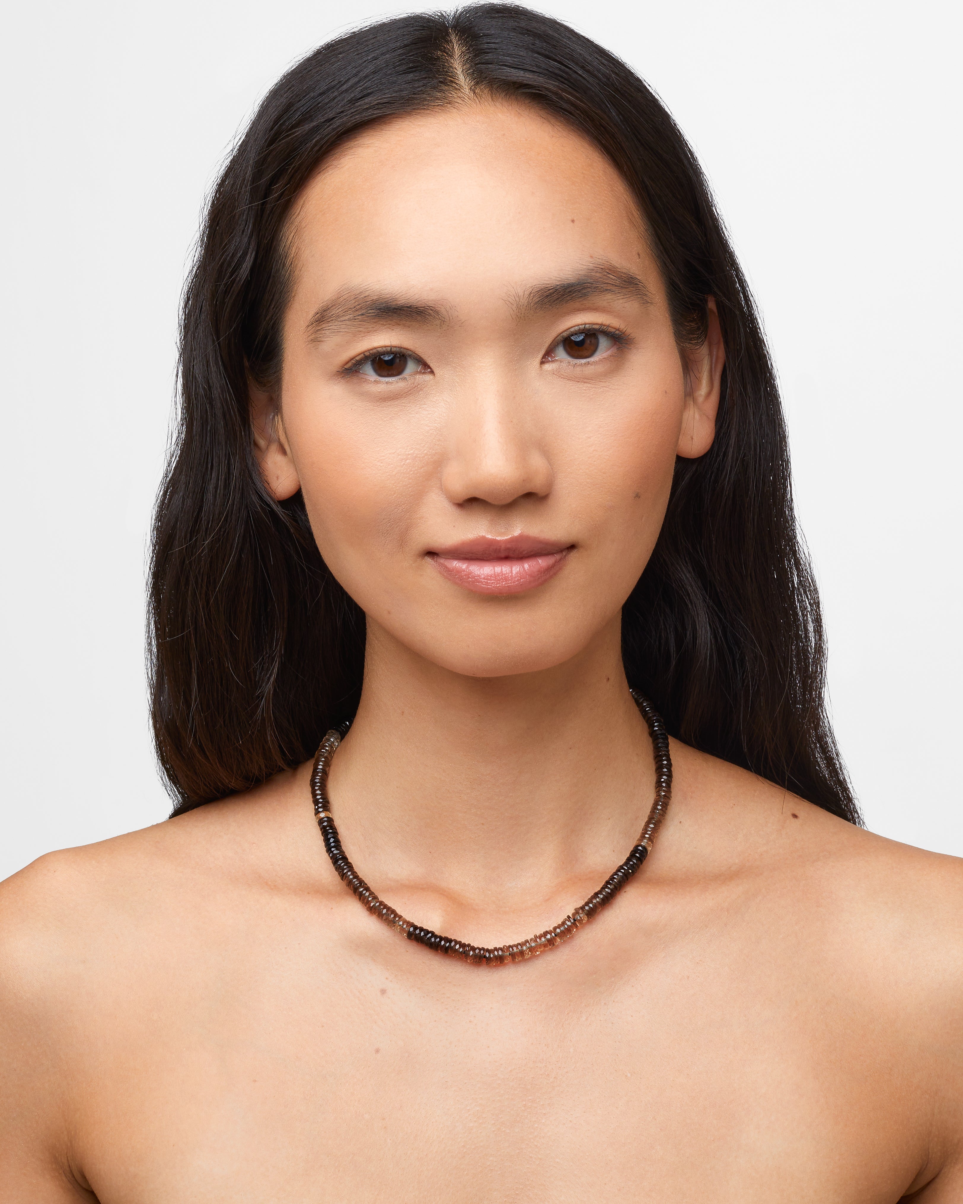 The Master of all grounding stones, the Smoky Quartz is beautifully hand cut in the faceted style and hand strung with silk in New York City. What makes this piece special is its faceted cut nature which gives it a natural sparkle. This necklace is finished in 14 karat gold hardware and chain.