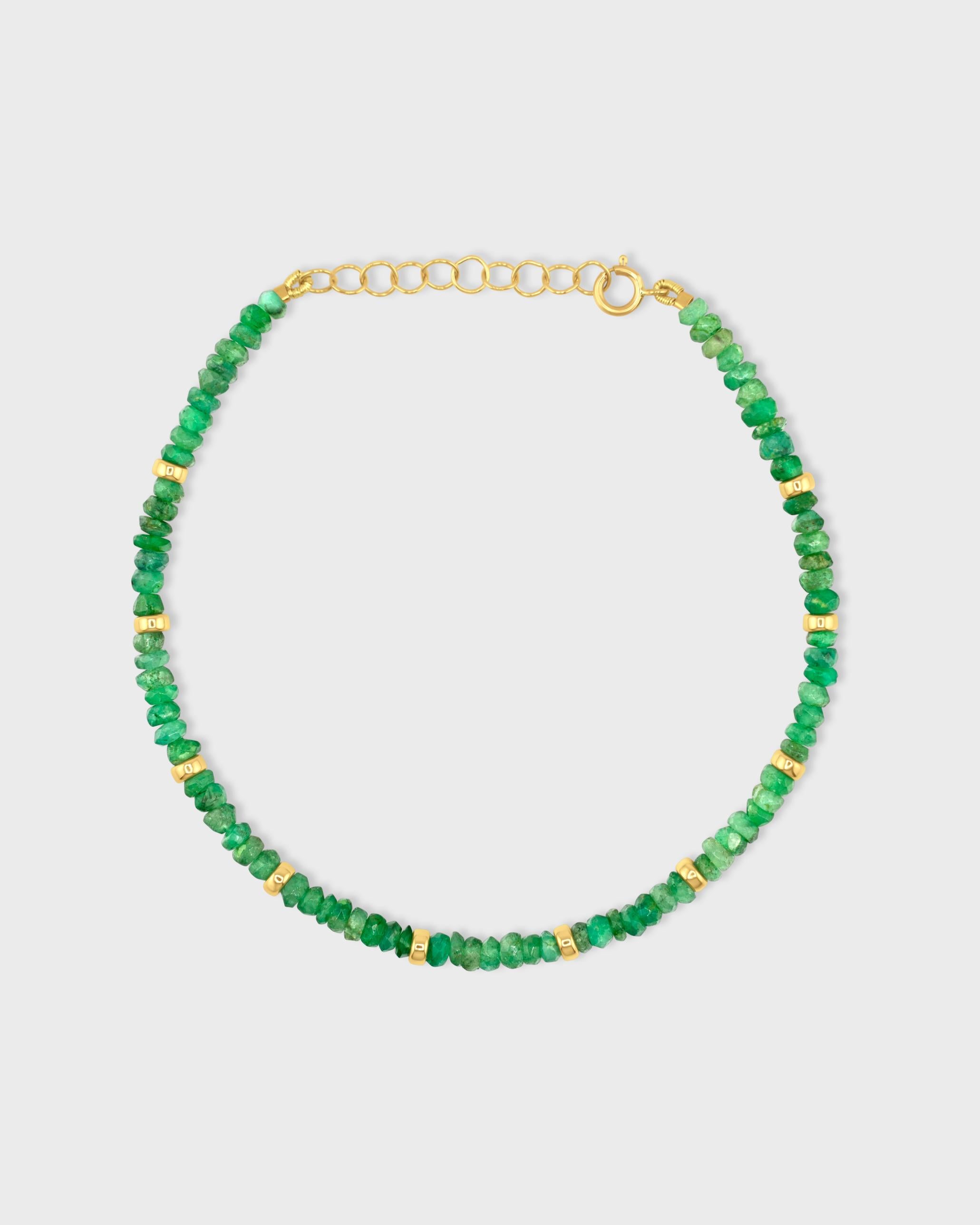 Faceted Emerald beads are thoughtfully hand-strung with gold accents in this refined bracelet, celebrating natural color and variation. A timeless piece that adds a gentle glow to the wrist.